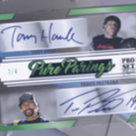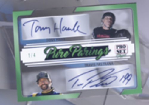 The Basics: There will be at least 11 different sets to chase within this one with parallels (not detailed in advance) all in play. Among them will be Action Ink, 1989 Pro Set, All That Glitters, All That Glitters Is Gold (1/1s), 1990 Pro Set, Legends, LFG!, Platinum, Pro Set Past, Pure Pairings (dual autos), Triography (triple autos) and Quadography (quad autos). ... Among the teased signers here? Steph Curry, Ric Flair, Joe Montana, Dan Marino, Adrian Peterson, Sandy Koufax, Emmitt Smith, Albert Pujols, Roger Staubach, Tony Hawk, Travis Pastrana, Tony Dorsett and Peyton Manning for starters. ... Others teased but not shown include Joe Burrow, Barry Sanders, Mike Tyson, Erling Haaland, Pele, Floyd Mayweather Jr., Nolan Ryan, Hulk Hogan, Vin Scully, Richard Petty, Deion Sanders, Naomi Osaka, Odell Beckham Jr., Don Mattingly, Rich Barry, Dikembe Mutumbo, Shaquille O'Neal, Johnny Bench, Steve Garvey, Mike Schmidt, Allen Iverson, Gary Payton, Penny Hardaway, Tony Parker and Damian Lillard. ... All cards in this one will be numbered to no more than 5o copies.