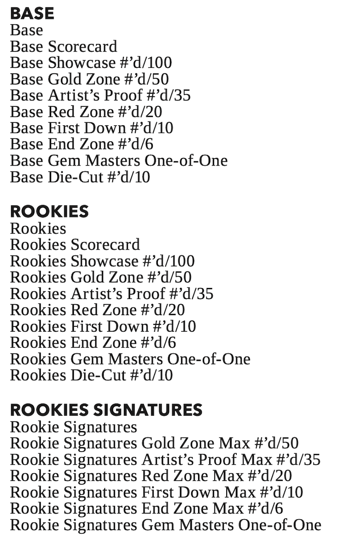 The Basics: There will be 40-card packs once again for this one with 10 parallels and 36 inserts in a typical box along with 90 Rookie Cards -- and there will be one lenticular insert and two base/rookie die-cut cards per case to chase, too. The base set will have 300 cards with each having nine parallels in hobby boxes (see gallery for breakdown) and the same will apply for Rookie Cards in this one. Rookie autos will also be in play here with parallels coming as low-volume creations -- nothing numbered over 50 copies. Among the inserts will be Toe The Line, Hot Rookies, NFL Draft, Fantasy Stars, Squad and Breakthrough for starters. Among the lenticular cards will be Intergalactic and Base Dynamics. ... Boxes will carry a suggested retail price of $120.