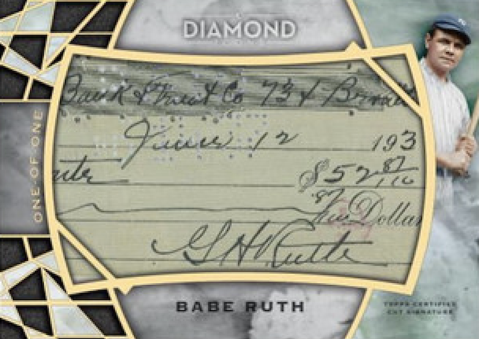 The Basics: There will be on-card autos, multi-colored patches and diamond cards in the mix with all ink on-card and limited to no more than 25 copies. On the autograph front there will standard autos, Red ink, Silver ink and Diamond Icons. Parallels for these include Black (/10), Red (/5) and 1/1 Gold. New Icons of the Diamond cards (/25) will be on acetate with the same parallels. Cut autos will be limited to four copies with 1/1 Gold versions, while Immortal Cuts will be 1/1s only. ... Auto Relics will include Jumbo Patches (/25 max) with the Black-Red-Gold rainbow, single-player auto Relics (/10 max) with Red and Gold versions, single-player dual-team auto Relics (/10 max) with the same parallels, single-player dual auto Relics (/10 max) as well as dual-player auto Relics. These will have Red and Gold parallels. ... Also in play will be Autographed Diamond Relics (/10) and Autographed Diamond In The Rough Relics (/5) that will only have 1/1 Gold parallels as well as dual-player auto diamond Relic books (/3) with a 1/1 Gold version. Also in play will be Pre-eminent Pieces Relics (/3) where players sign directly on pieces of game-used cleats embedded into the cards. They will also have Gold parallels. ... For standard Relics, there will be single-player cards (/10), dual-player books (/10), Diamond In The Rough Relics (/5), Pre-eminent Pieces (/10) with 1/1 spikes versions and MLB logo patches that are 1/1 cards. Relics will have Red (/5) and 1/1 Gold parallels.