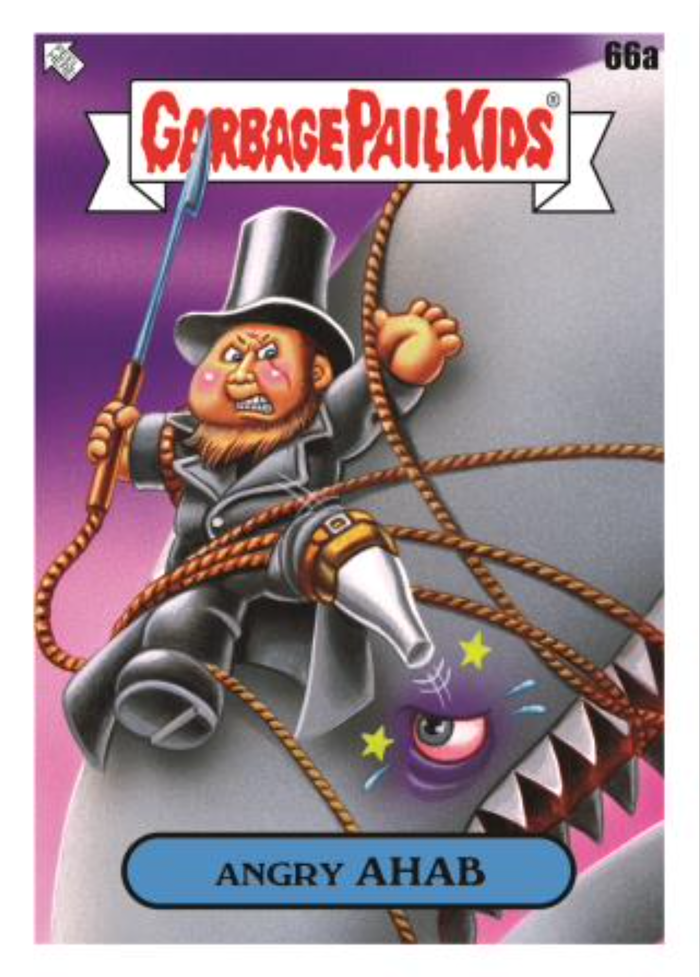 The Basics: The basic set will consist of 200 stickers (100 images with A and B names) with several parallels per card -- Booger Green, Inkwell Black, Moby Dick Grey (/199), Sleep Drool Blue (/99), Red Herring (/75), Fool's Gold (/50), as well as 1/1 printing plates and artist autos. ... Inserts will include Authors of Their Own Misfortune (three per box), Wacky Package Prose (one per box) and Book Marked (one per). ... Also to be found will be GPK patch cards (/199) with Blue (/99), Red (/75), Gold (/50) and 1/1 Foilfractors. Joining them will be sketch cards, shaped sketch cards and triptych sketches that are three-panel foldouts. Each will be 1/1 creations. Also in play will be GPK Iron-on Patch Cards.