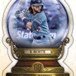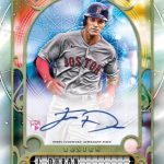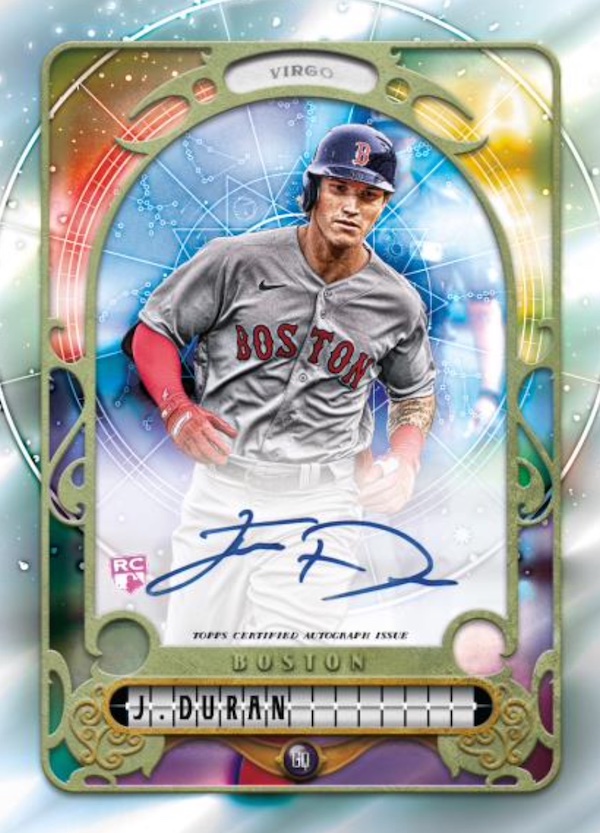 The base set will once again be 300 cards -- a mix of rookies and veterans with missing nameplate, Burnt Umber (/399), Indigo (/250), Turquoise (/199), Blue (/150), Mauve (/75), Black & White (/50), Ruby Red (/10) and 1/1 Black parallels. There also will be short-prints that will only have the nameplate, Blue and Black parallels, while the Jackie Robinson Day image variations will only have 1/1 Black parallels. That same 1/1 only approach will apply to other photo variation cards in the release. ... New inserts this year will be Gypsy Gems -- players and their birthstones shown on the cards (like an Allen & Ginter release, not embedded rocks) with those having Indigo (/250) and 1/1 Black parallels. This will be four per box. There also will be Crystal Gazing die-cut cards with the same parallels. These will be two per box. ... Autographs will include standard as well as Indigo (/150), Blue (/99), Black & White (/50) and 1/1 Black, while Mini Rookie Autos (/TBD) also will be in play but only with Black & White and Black parallels. There will also be Gypsy Gems Mini Autos (/TBD) with 1/1 Black cards as well as image variation autos (/TBD) with Black & White parallels (/42) and 1/1 Black versions. Joining them will be Astrological Chrome auto variaitons (/99) with 1/1 Supers to be found. ... Auto Relics will include Autograph Garments (/50), Auto Patch Books (/20), Pull-up Sock Auto Relics (/10) and 1/1 Autographed Lineup Cards. The first three will only have 1/1 Black parallels. ... Three Chrome cards apparently will not be a box-topper this time but will be in packs with Indigo (/150), Blue (/99), Gold (/50), Red (/5) and 1/1 Supers as well as autographs (/25) which will also have their own Supers.