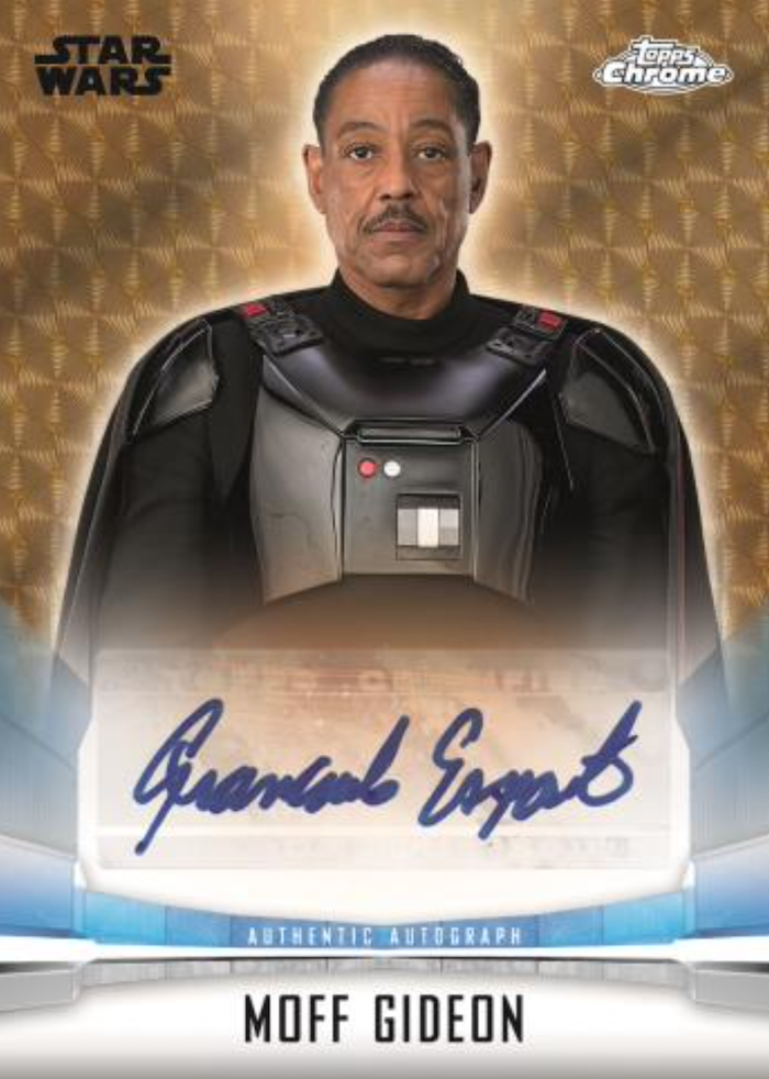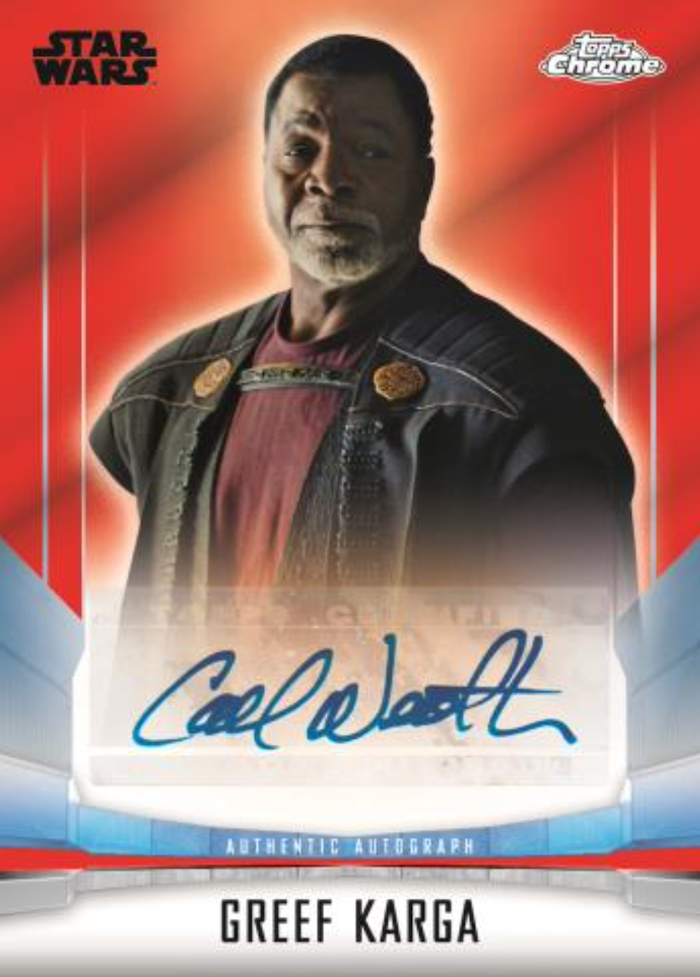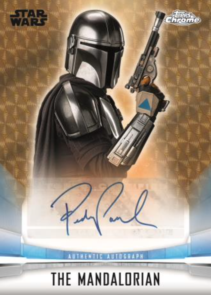 The Basics: Each standard pack of this one will include three base cards and a Refractor from a 100-card set. Each will have Blue (/99), Purple (/75), Green (/50), Orange (/25), Black (/10), Red (/5) and 1/1 Superfractors. There will be at least three insert sets -- Illustrated Characters, Armored & Ready and Chrome Comic Covers -- and they will have a smaller volume of parallels -- Blue, Green, Orange, Red and Supers -- at the same volumes. A fourth set teased is Mandalorian Legends, which appear to be die-cut cards. There also will be short-prints in the mix but no additional details are known for those in advance. ... Among the autographs will be a number of Refractor parallels -- Blue (150), Green (/99), Purple (/50), Orange (/25), Red (/5) and 1/1 Supers -- and then there will be duals (/25) and triples (/5) to be found, too. Duals will have Red and Superfractor parallels while triples will only have Supers. ... Sketch cards will be found in standard form as well as shaped versions. Among the teased signers here are Mercedes Varnado (WWE's Sasha Banks), Pedro Pascal, Giancarlo Esposito and Carl Weathers.