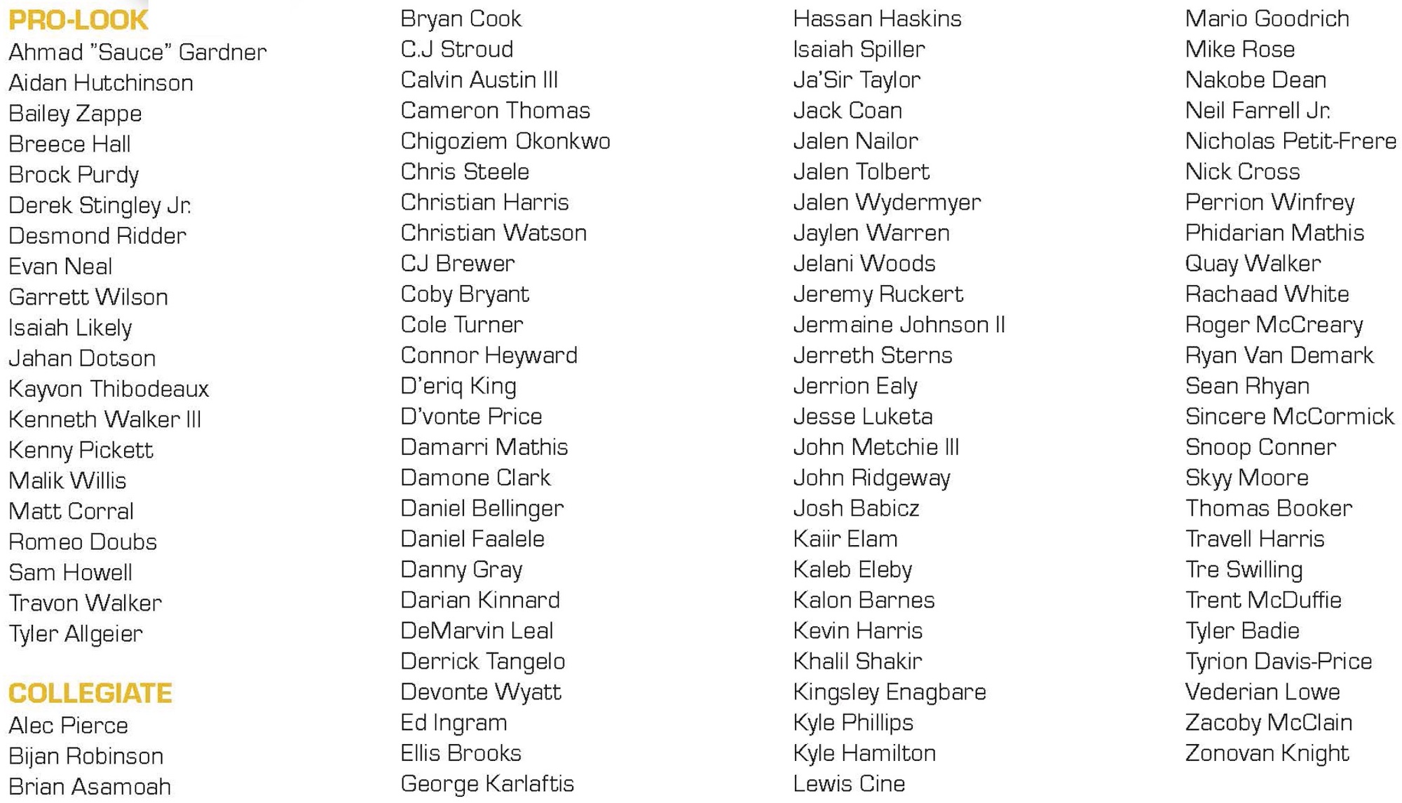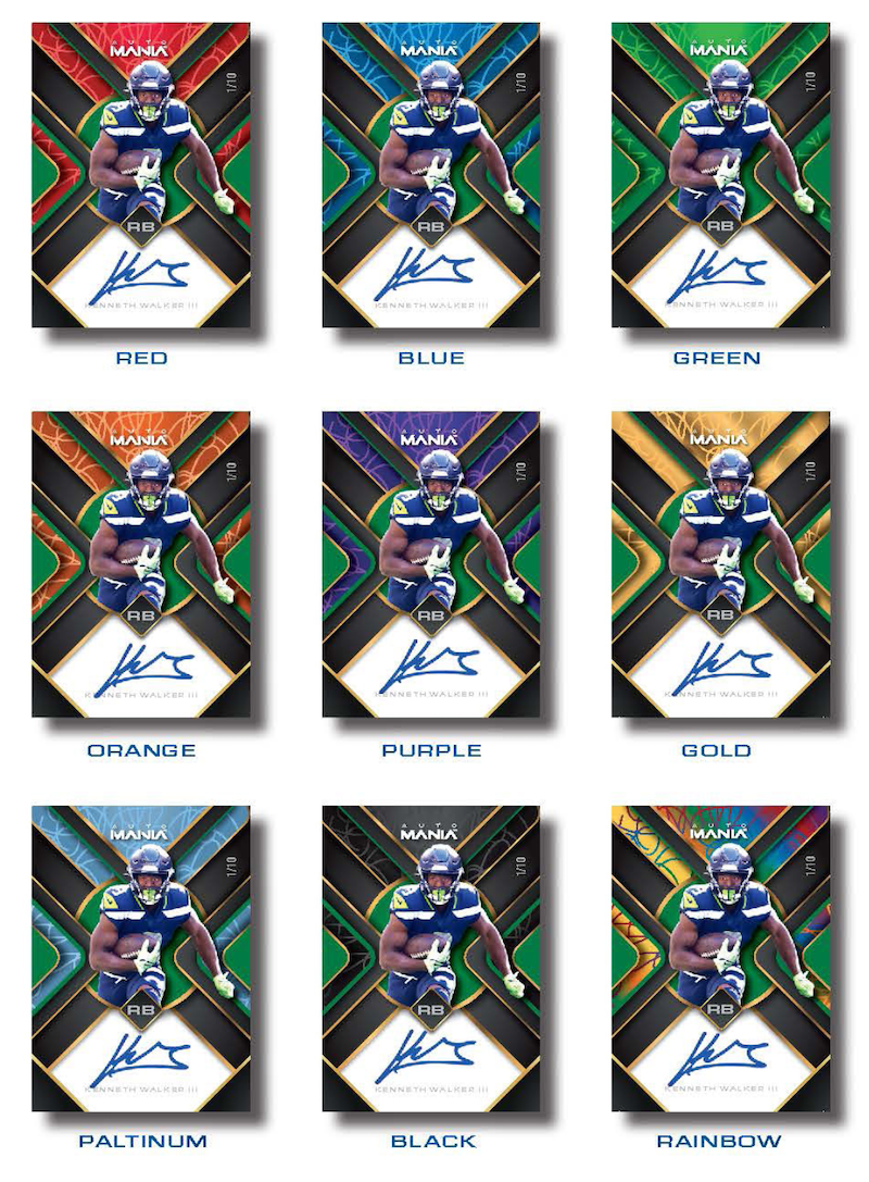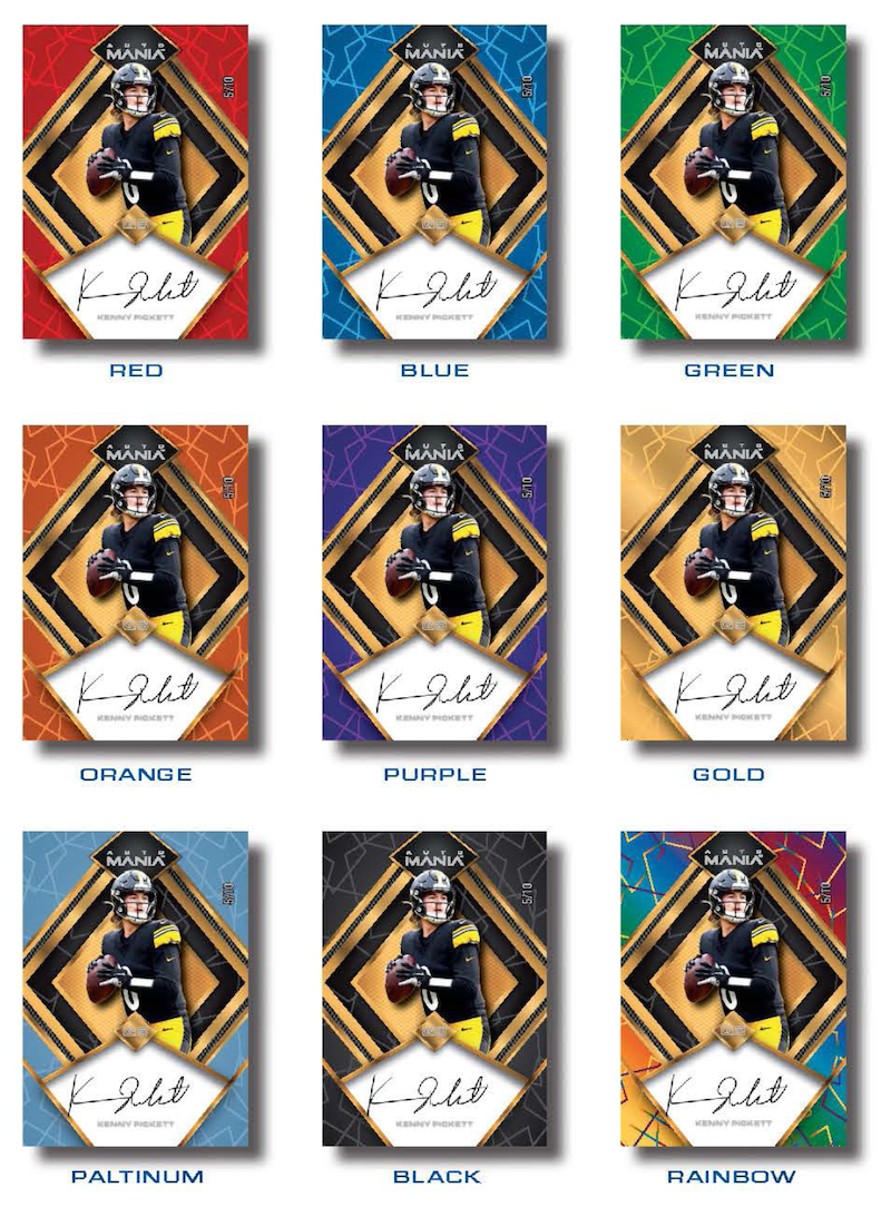 The Basics: Just 400 cases will be made for this release, which is nothing but autographs from 100 players on three patterns of cards each with rainbows. There will be Diamond, Triangle and Square cards in this one with each having nine simple-to-identify parallels -- Red, Blue, Green, Orange, Purple, Gold, Platinum, Black and Rainbow. There will be magnetic cases for the best cards (/10 or less; at least one per box) and snap holders for the rest. ... Among the teased players are Kenny Pickett, Kenneth Walker III, Bailey Zappe, Desmond Ridder, Sam Howell, Aidan Hutchinson, Garrett Wilson, Breece Hall, C.J. Stroud and a bunch of other guys you can all see on the player list below.