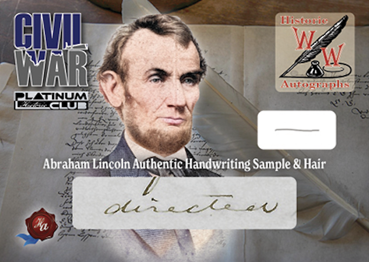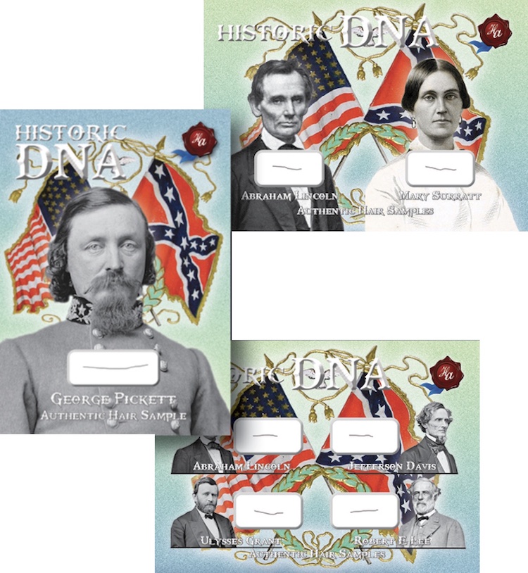 The Basics: There will be only 155 cases made for this one with "special" inserts being DNA hair cards, cut autos, Abraham Lincoln funeral rose relics, Lincoln handwriting samples and Lincoln handwriting/hair cards. Among the other inclusions in a box will include low-numbered foil cards, handwriting samples, touched document relics or 1/1 art cards found in every ninth box. ... Cut signatures will be found in every other box with five Lincoln signatures, two Ulysses S. Grant signatures, two Robert E. Lee signatures and six Jefferson Davis signatures in the release. Funeral rose cards are one in 18 boxes, while Lincoln handwriting cards are one in four and his cards adding a piece of hair are one in 37. Other handwriting cards are one in six. Standard DNA hair cards for others are found in every fifth box. ... All foil cards (/10 max) are three or four per box here.