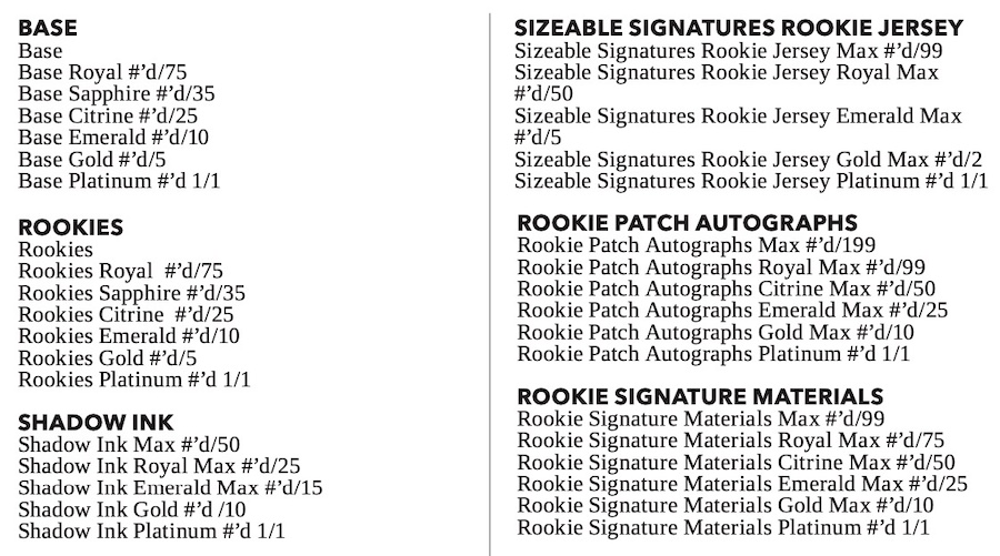 The Basics: Each box will include one base card and one parallel (breakdown in gallery) this time around atop the hits just like previous years. ... Among inserts will be White Night, Forcefield, Prolific and Vanta cards. ... Among the autographs are Shadow Ink, Rookie Patch Autos (/199 max), Rookie Signature Materials, Sizable Signatures rookie jersey autos, Blacked Out jersey autos and Iconic Impact Ink acetate autos. Other ink also includes Midnight Signatures, Capstones, Smoke Show Signatures and Spotlight Signatures. ... Among the memorabilia sets are Futuristic, Rookie Influx and Starlight Materials. ... Note: Rookies shown here are last year's players on mocks to show the look of how they will appear in NFL uniforms. ... Boxes carry a suggested retail price of $150.