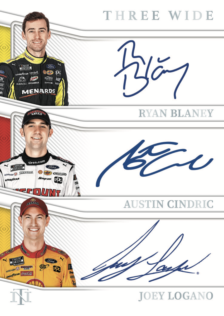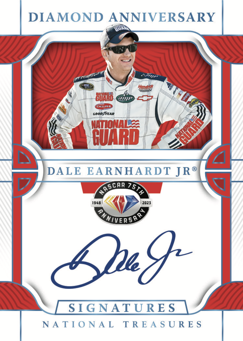 The Basics: Among the ink in this one will be Diamond Anniversary Signatures, Three Wide Signatures (on-card autos for teammates, car numbers and more), Track Pass autos, Premium Patches, Firesuit Signatures, cut autos, Rising Stars autos, rookie patch autos, Retro Rookie Materials Autos and, of course auto-mem booklets in play, which will once again be found in every box. They'll include either an auto and a jumbo or two jump swatches and include some new focuses such as Daytona Legacy. Highlights and other memorable situations will be found on Treasured Moments cards. ... A new twist for this one will be a White Sparkle Prizm pack inside each box with either the familiar parallels or a 1/1 autograph. ... These boxes once again carry a suggested retail price of $400.
