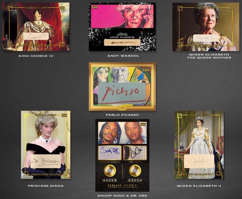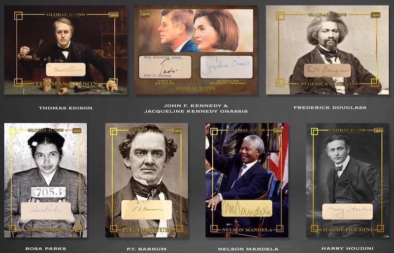 The Basics: Among the subjects here are inventors, presidents, actors, musicians, artists, royalty, athletes, business icons and more. All cards also include a real silver or gold bar logo, too. Among the subjects teased in this one are Queen Elizabeth, Queen Elizabeth II, Andy Warhol, King George IV, Pablo Picasso, Princess Diana, Snoop Dogg, Dr. Dre, Robert DeNiro, Al Pacino, Tim Robbins, Morgan Freeman, Aaron Paul, Bryan Cranston, John Travolta, Eddie Murphy, Arsenio Hall, Desi Arnaz, Lucille Ball, Will Ferrell, Woody Harrelson, Chris Tucker, Jackie Chan, Samuel L. Jackson, Thomas Edison, John F. Kennedy, Jacqueline Onassis, Frederick Douglass, Rosa Parks, P.T. Barnum, Nelson Mandela and Harry Houdini. ... The company also teased other artwork to be used here as well as in future similar releases. ... Boxes carry a suggested retail price of $999.