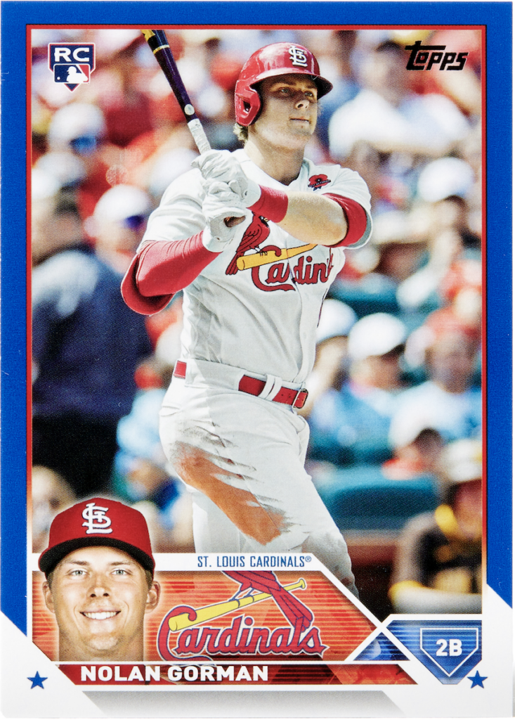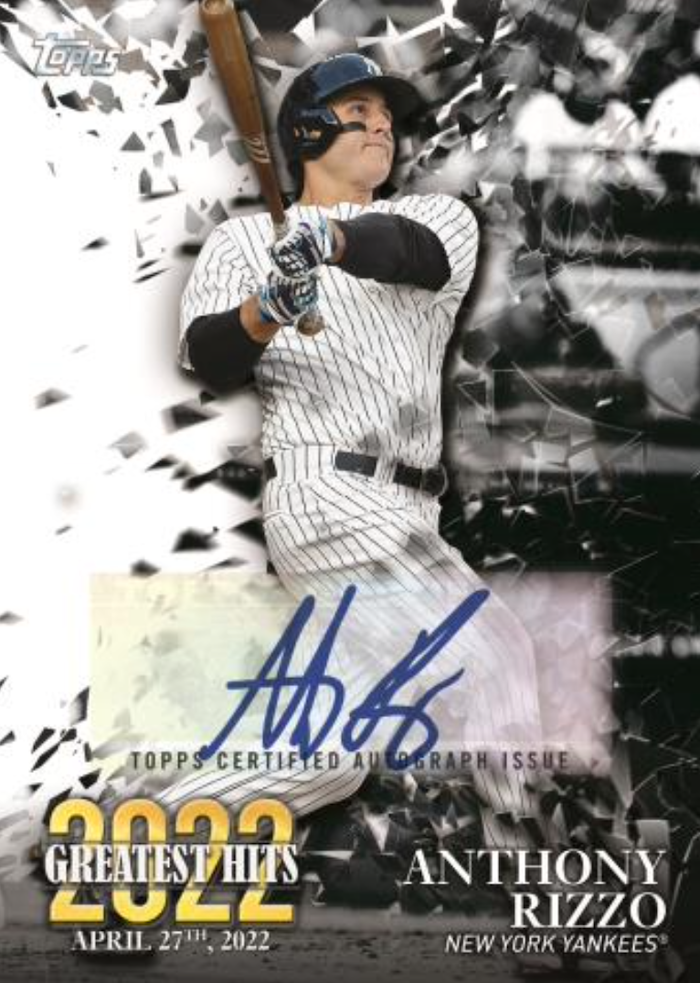 Among the inserts will be One-Two Punch (pitching duos), Welcome to The Club (30/30, 40/40 and 20/20/20 Club members), 2022's Greatest Hits (key hits), All Aces, 1988 Topps, Heavy Lumber and AKA (nicknames). The first four sets will have Blue, Black (/299), Gold (/75), Red (/10) and 1/1 parallels as well as autographs for some players (/10 max). The 1988 cards will have Blue (announced as 600 copies), Black (/299), The Real One parallels on retro stock (/88), Gold (/75), Red (/10) and 1/1 Platinum versions. The Heavy Lumber cards are printed on wood stock, while AKA cards will just have a standard version and are "limited." Home Run Challenge cards are also back one per box in both formats. Box-toppers will include 1988 Topps oversized cards with some having autographs (/TBD).