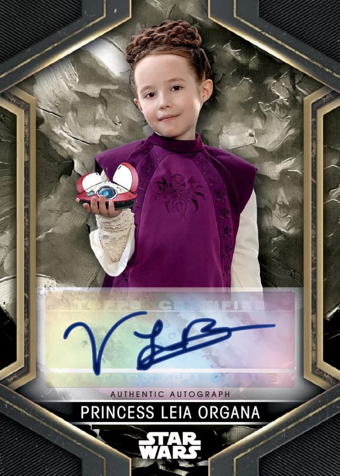 The Basics: The 100-card base set will recap the adventure of the Disney+ series so far and feature eight parallels per card -- Blue, Purple, Red (/99), Green (/75), Bronze (/50), Silver (/25), Gold (/10) and 1/1 Black. There will be five insert sets for this one -- Heroes, Darth Vader and The Inquisitorius, Concept Art, Creatures & Aliens and Droids -- and each also will have a small lineup of parallels. They'll include Red, Bronze, Silver, Gold, Black Metal (/5; hobby-only finds for the first two sets only), Black and also 1/1 printing plates. (Same volumes unless noted.) ... Autographed cards will be found as singles, duals and triples for this one with Red, Green, Bronze, Silver, Gold, Black and plates for the solo cards (same volumes), while duals will only have Gold and Black parallels and Triples will only have 1/1 Black versions to chase. ... Relics also will be in play here, though the initial details are slim. There will be costume Relics (Bronze, Silver, Gold, Black) as well as manufactured patches (Red, Silver, Gold, Black) and commemorative character coin cards (Silver, Gold, Black). ... Among the signers here will be Vivien Lyra, Ewan McGregor, Hayden Christensen, Ian McDiarmid and Moses Ingram for starters.