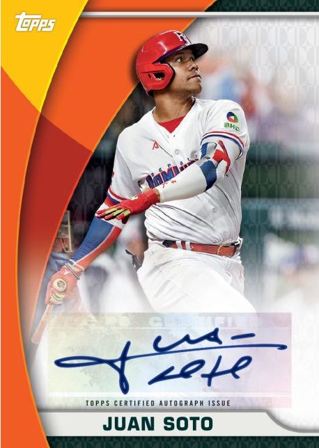 The Basics: The base set is just 100 cards here showcasing stars from all 20 countries at the event, many of whom are MLB players or could be in the future. There will be Cracked Ice (/99), Green Sparkle (/75), Rainbow (/50), Orange Cracked Ice (/25), Black Diffractors (/10), Red Hot Foil (/5) and 1/1 Foilfractors in play for this one. There also will be image variations with five parallel colors to be found (see odds link above). ... Among the inserts will be 20 Captains Of The Classic, a 30-card 2006 Topps set, 10 International Gems and 10 Global Grandeur cards. ... For hits, there will be base autos paralleling some in the base set as well as in the variations along with inked parallels for Gems. Also in play will be Country Debuts autos with parallels, a batch of WBC Relic autos, Nameplate Patch Relic book autos and WBC Base Relics. ... Among the notable autos here? Julio Rodriguez, Juan Soto, Kyle Schwarber, Luis Robert, Mike Trout, Pete Alonso, Ronald Acuña Jr., Shohei Ohtani and a number of other MLB players among a deep checklist. You can see them all at the checklist linked above. ... Boxes carried a suggested retail price of $79.99 via Topps with a limit of four boxes.
