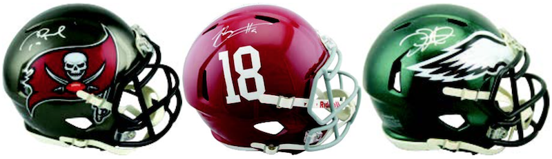 The Basics: The format is simple -- a signed mini from top NFL or college stars inside each box -- and there are Touchdown Treasures boxes that will yield bonus tickets good for larger items. There's also a new twist this time -- Extra Point Tickets that give you a second autographed mini helmet in your box via a redemption. Among the Treasures items are a signed Tom Brady jersey, a D.K. Metcalf autographed football, a full-size Bryce Young Alabama helmet and a J.J. Watt autographed 16-by-20 photo. ... Names teased for this one include Patrick Mahomes, Brady, Young, Jalen Hurts, Peyton Manning, Travis Kelce, A.J. Brown, Andre Johnson, Joe Burrow, George Kittle, Justin Herbert, Ja'Marr Chase, Stefan Diggs, Gale Sayers, Steve Young, Brett Favre, Barry Sanders, Tony Gonzalez and Julius Peppers for starters. ... Cases will include six Hall of Famers, three "football favorites" and one current star with all items authenticated by TRISTAR, PSA/DNA, BAS or JSA. ... You can see all of what was teased for this release in the gallery below.