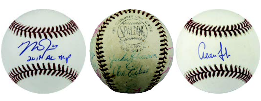 The Basics: The Grand Treasure ball in this one is a 1956 Brooklyn Dodgers team ball (above center) with ink from Jackie Robinson, Roy Campanella, Don Drysdale, Walter Alson, Pee Wee Reese, Gil Hodges and many other iconic stars from the team. ... Diamond Treasures baseballs will be found here for Ted Williams and Carl Hubbell here, while every 12-box case will include six Hall of Famers, two inscribed baseballs, two specialty baseballs, one star baseball and one "first" inscribed achievement baseball. Among the other chase elements here are logo balls, inscribed balls and colored baseballs such as gold and black. ... All baseballs are authenticated by TRISTAR or other third-party authenticators for this release with all serial-numbered within the release -- no more than 24 copies of any ball in this one -- and only 100 cases will be made. ... Among the other stars teased for this one? Mike Trout, Aaron Judge, Shohei Ohtani, Bryce Harper, Tony Gwynn, Mike Schmidt, Ken Griffey Jr, Kirby Puckett, Nolan Ryan, Reggie Jackson, Eddie Murray, Mariano Rivera, Carlton Fisk, David Ortiz, Tom Glavine and Craig Biggio.