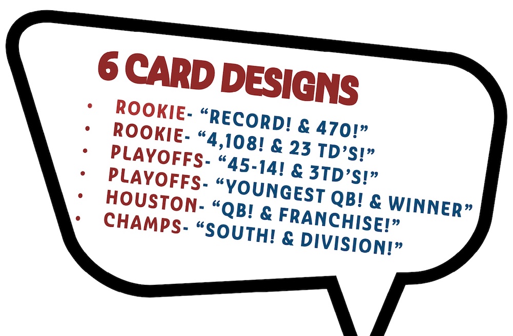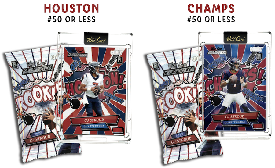 The Basics: All cards in this one will be encased, limited to no more than 50 serial-numbered copies and each will be foil-wrapped in a pack of their own inside each box. There will be six card designs for this one -- Rookie (two types), Playoffs (two types), Houston and Champs. There also will be 10 color parallel combos for this one -- see gallery for details on both rainbows -- while Stroud's autographed cards will be on what's called a White Comix card and will be limited to no more than seven copies. Those will be found one per case on average.