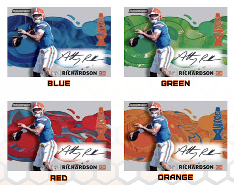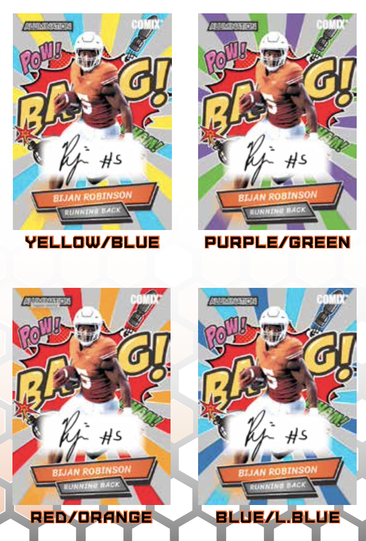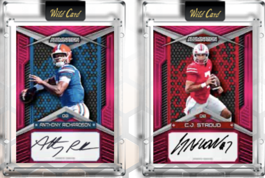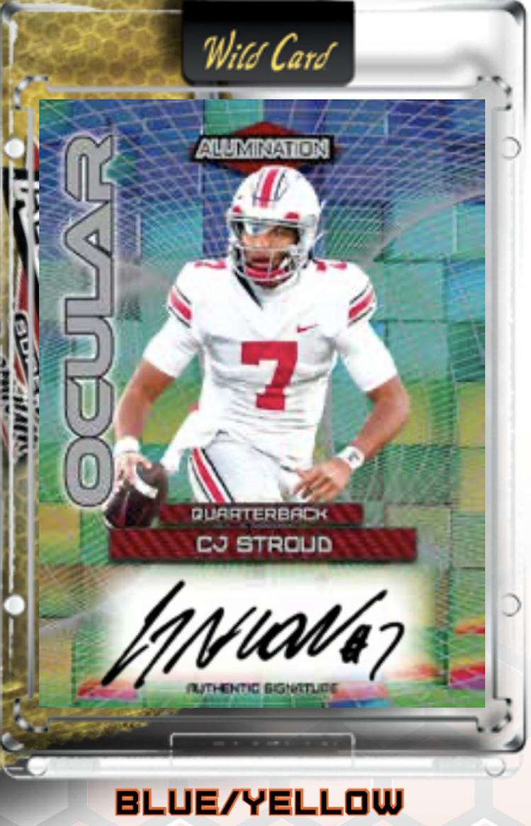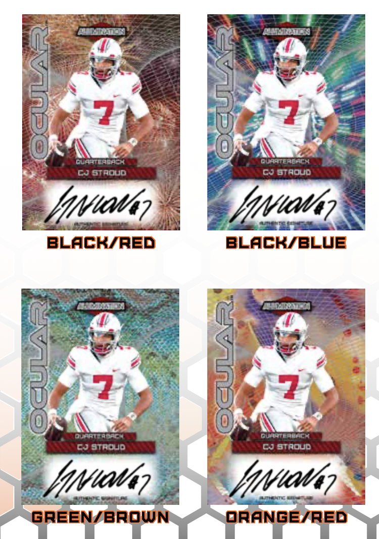 The Basics: All cards in this one will be signed, numbered and encase with three packs per box being base autos, two packs being Premium (/25) and one Super Premium pack being for cards (/5) at most (rarer base autos and insert autos). The base autos checklist includes 125 players, while five insert sets will only include 50 players. Those sets will be Comix, Groovin', Ocular, Psyched and Smashing. ... Base autos will have three colors -- Silver, Gold and Black -- while the Premium packs will be the home to Pink parallels for all 125 players and inserts. ... Groovin' inserts will be /25 or less with those having Purple, Blue, Green, Red and Orange versions. That same lineup will be in play for Smashing cards. ... Ocular cards will be capped at five copies per card and those will have dual-color versions -- Blue & Yellow, Black & Red, Green & Brown, Black & Blue and Orange & Red. Comix also will be /5 with Rainbow, Yellow & Blue, Purple & Green, Red & Orange and Blue & Light Blue versions. The Psyched cards also will cap at /5 will have colors and textures in play with Rainbow/Splat, Rainbow/Tunnel, Green & Yellow, Pink & Teal and Rainbow Swirl cards. ... Among the players here -- full list below -- are Bryce Young, C.J. Stroud, Hendon Hooker, Jahmyr Gibbs, Anthony Richardson, Bijan Robinson, Will Anderson and Will Levis to name a few.