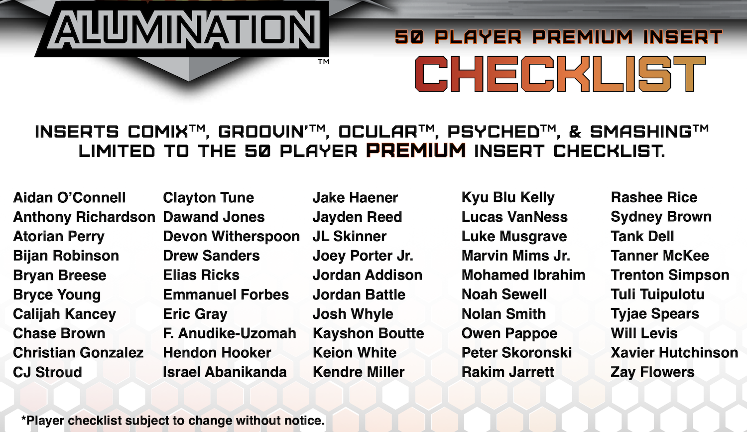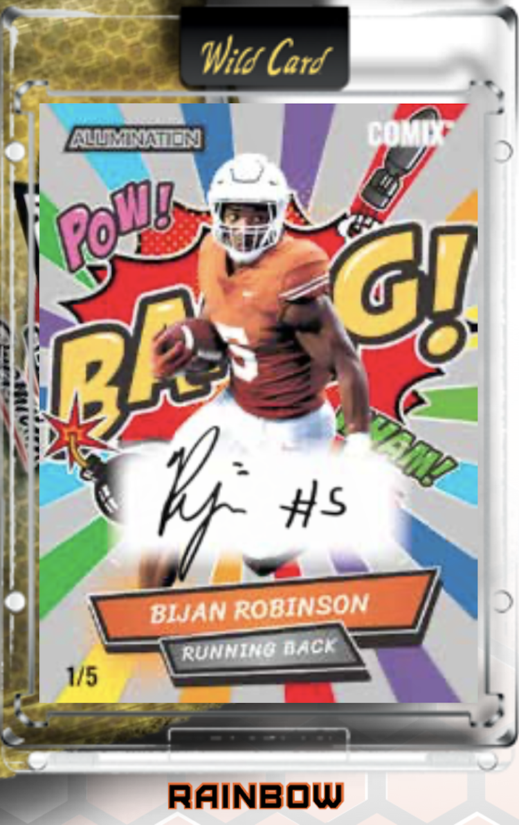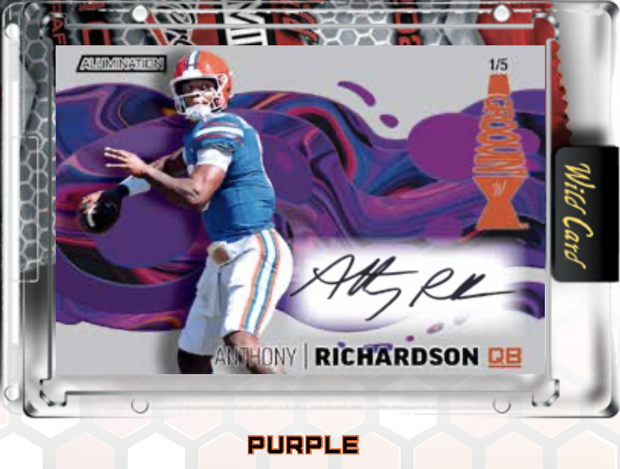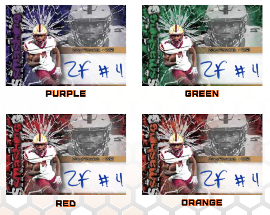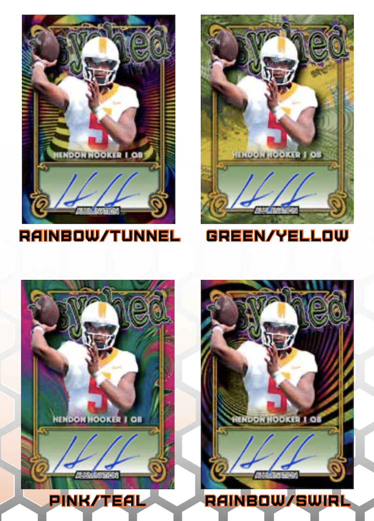 The Basics: All cards in this one will be signed, numbered and encase with three packs per box being base autos, two packs being Premium (/25) and one Super Premium pack being for cards (/5) at most (rarer base autos and insert autos). The base autos checklist includes 125 players, while five insert sets will only include 50 players. Those sets will be Comix, Groovin', Ocular, Psyched and Smashing. ... Base autos will have three colors -- Silver, Gold and Black -- while the Premium packs will be the home to Pink parallels for all 125 players and inserts. ... Groovin' inserts will be /25 or less with those having Purple, Blue, Green, Red and Orange versions. That same lineup will be in play for Smashing cards. ... Ocular cards will be capped at five copies per card and those will have dual-color versions -- Blue & Yellow, Black & Red, Green & Brown, Black & Blue and Orange & Red. Comix also will be /5 with Rainbow, Yellow & Blue, Purple & Green, Red & Orange and Blue & Light Blue versions. The Psyched cards also will cap at /5 will have colors and textures in play with Rainbow/Splat, Rainbow/Tunnel, Green & Yellow, Pink & Teal and Rainbow Swirl cards. ... Among the players here -- full list below -- are Bryce Young, C.J. Stroud, Hendon Hooker, Jahmyr Gibbs, Anthony Richardson, Bijan Robinson, Will Anderson and Will Levis to name a few.