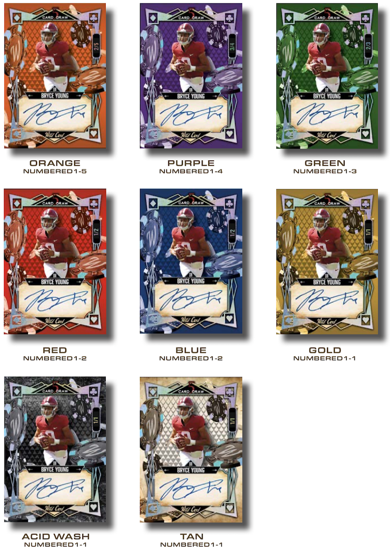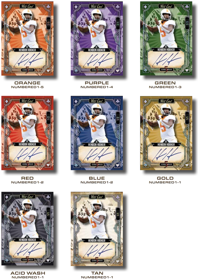 What's buzz-worthy: Wild Card's once again on a very numbers-based presentation for college football stars' autographs with five serial-numbered cards inside numbered packs that add some certainty to the chase -- every card is numbered to no more than five copies across the entire release and every box includes a 1/1 card.