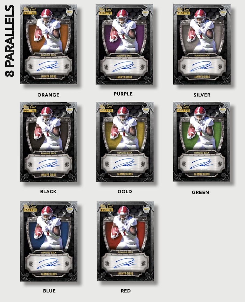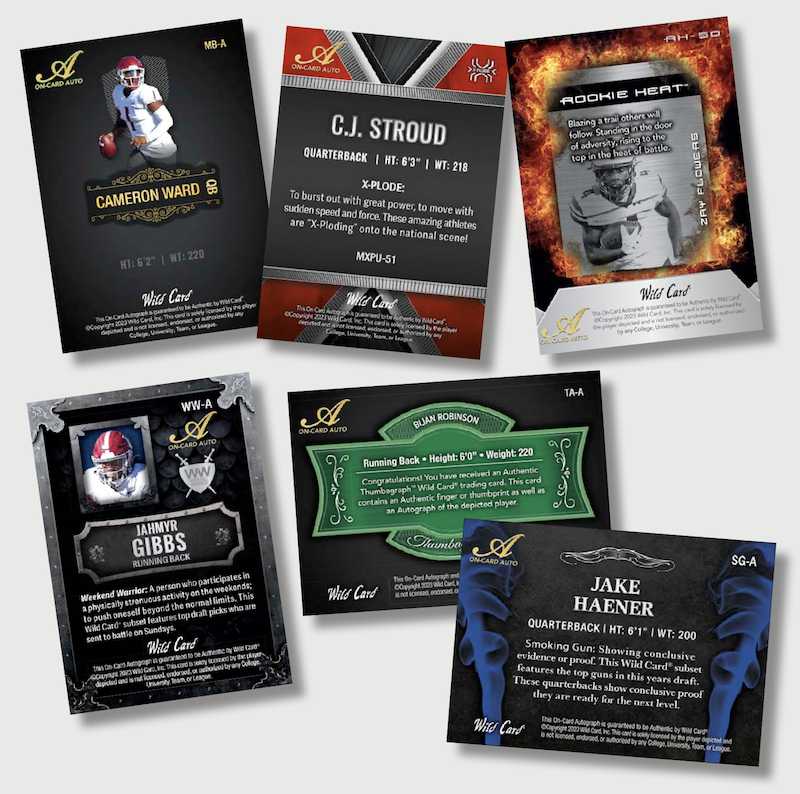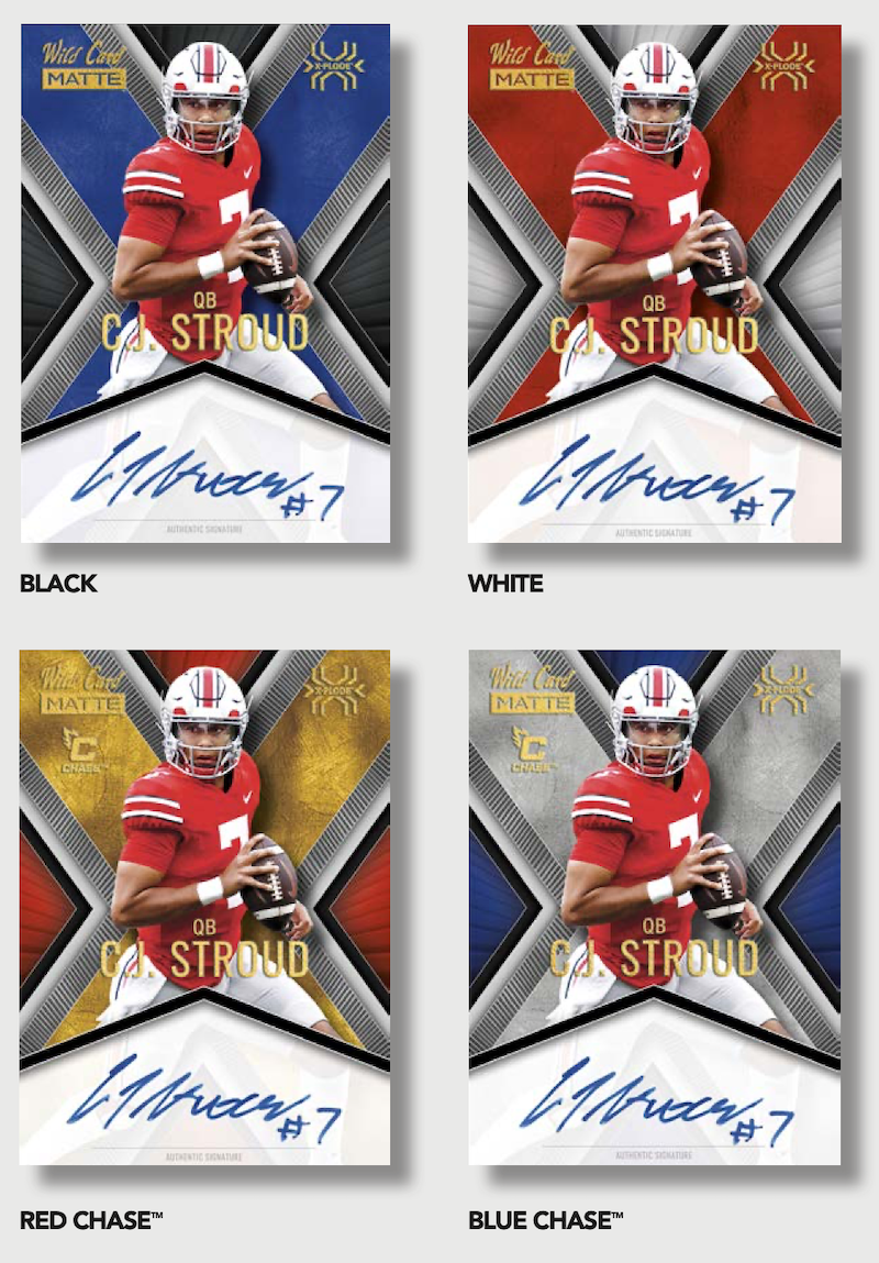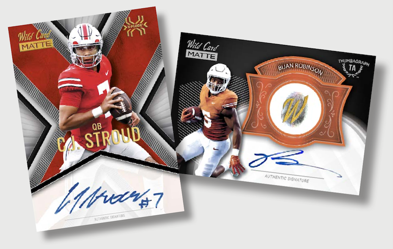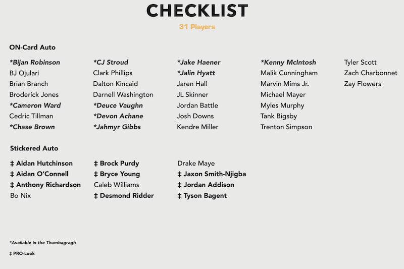 The Basics: The split format here means two inner cases per case with one being Black and one being White and inside each of those are guaranteed autos from C.J. Stroud and Bijan Robinson (four per overall case) and inside Black cases there are also shots at Red Chase boxes and inside White cases are shots at Blue Chase boxes. All cards are limited to no more than 25 copies in both colors. Chase boxes will include those parallel colors as well as Gold, Silver, Green and Purple. ... As an authenticity device, all cards will have a a foiled "on-card auto" logo on each card back. ... Among the finds will be Rookie Heat, X-Plode, Weekend Warrior, Smoking Guns and Thumbagraph cards. The first three will have eight parallel colors per set -- see the breakdowns in the gallery -- atop there being Black/White versions as well as the Chase box versions. The Guns cards will have 10 parallels as will the Thumbagraphs, which carried actual player thumbprints last year and figure to this year as well. Just 31 players are included in this one with only 10 signing on for Thumbagraphs (noted below). ... The roster includes Bijan Robinson, BJ Ojulari, Brian Branch, Broderick Jones, Cameron Ward, Cedric Tillman, Chase Brown, CJ Stroud, Clark Phillips, Dalton Kincaid, Darnell Washington, Deuce Vaughn, Devon Achane, Jahmyr Gibbs, Jake Haener, Jalin Hyatt, Jaren Hall, JL Skinner, Jordan Battle, Josh Downs, Kendre Miller, Kenny McIntosh, Malik Cunningham, Marvin Mims Jr., Michael Mayer, Myles Murphy, Tank Bigsby, Trenton Simpson, Tyler Scott, Zach Charbonnet and Zay Flowers.