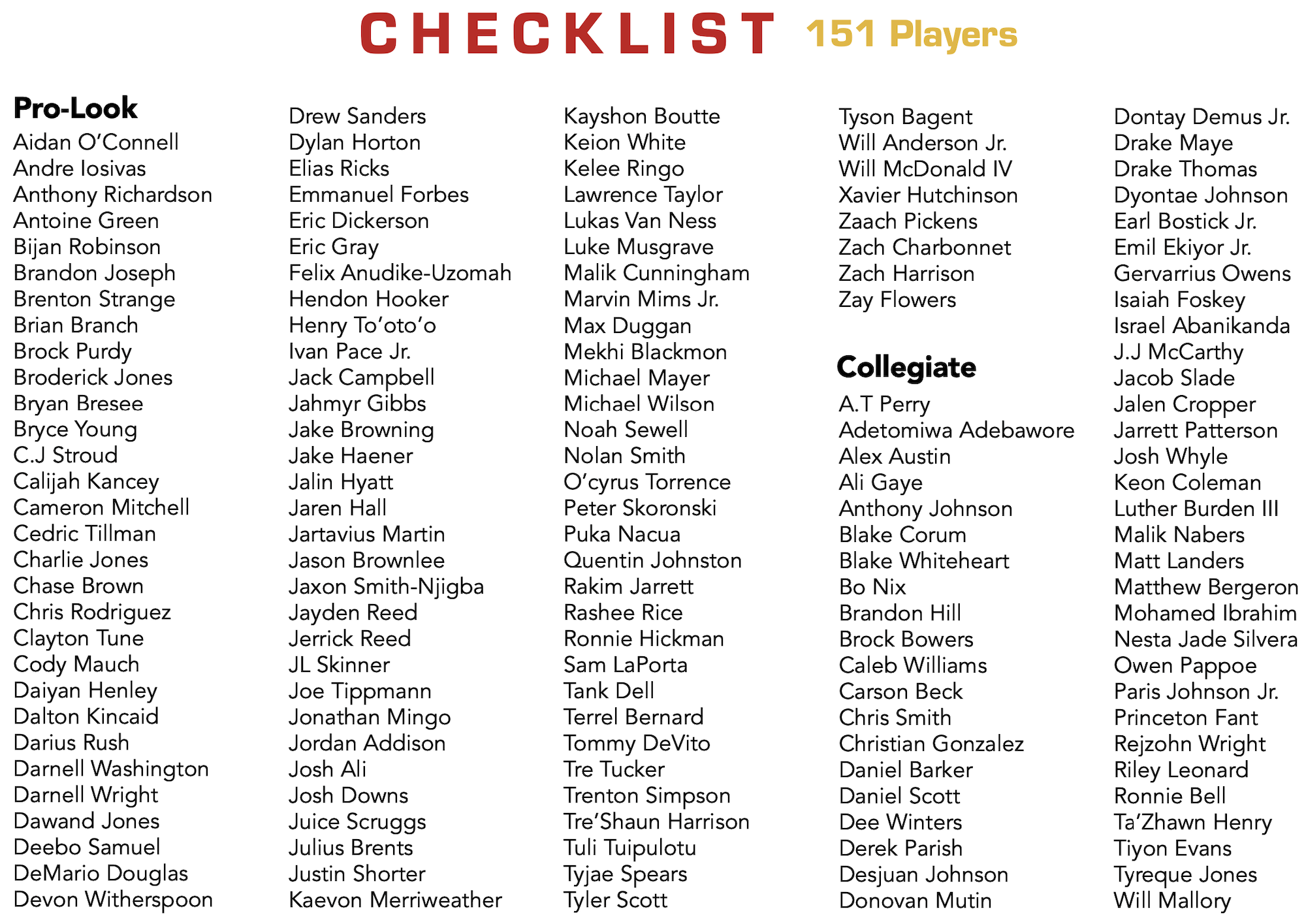 The Basics: All cards in this one will be signed, numbered and encased with five types 0f cards in play -- WildMarble (/25), WildLight (/15), WildGlass (/10) WildPaint (/5) and the rarer WildFractal 1/1s (up top) that are found one in every fourth box or so. New here will be 1/1 SuperFractal cards with those being at a case-hit level. All cards will be limited to no more than 25 copies for this release with players from a 151-name checklist (see gallery). Each will have parallels beyond the basic autos and you can see how those break down below. Each will have eight colors with textures atop that. ... Among the names signing on here? C.J. Stroud, Anthony Richardson, Bijan Robinson, Brock Purdy, Deebo Samuel, Jahmyr Gibbs, Jordan Addison, Lawrence Taylor, Luka Nacua, Will Anderson Jr., Bo Nix, Brock Bowers, Caleb Williams, Drake Maye, J.J. McCarthy, Eric Dickerson and Tank Dell. That's a mix of NIL stars, current stars and Hall of Famers and you can see all players below.