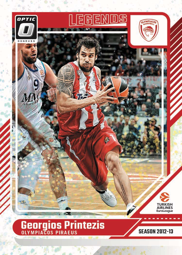 The Basics: Boxes will include 48 cards and include four Optichrome cards, 12 parallels and 18 more inserts along with the auto and base cards in this one. The 200-card base will have subsets that include 35 EuroLeague Legends, five All-EuroLeague First Team members and five Rated Prospects. ... All 200 cards will have Press Proof parallels that will include Silver, Purple (/275), Holo Laser (/149), Purple Laser (/99), Orange Laser (/75), 25th Anniversary (/25), Yellow Stars (/5), Gold Laser (/10) and 1/1 Black Laser. ... Optichrome parallels also will be in play for them all and will include White Sparkle, Optic Holo, Red (/99), Blue (/49), Gold (/10) and 1/1 Gold Vinyl. ... Among the autographs will be Signature Series, Net Marvels, duals and Dominators with Holo Laser parallels including Red (/99), Blue (/49), Purple (/25), Gold (/10), Yellow Stars (/5) and 1/1 Black. ... Among the inserts will be Unleashed, Team Logo, Net Marvels, Reigning Threes, Crunch Time, Highlights and EuroLeague Leaders. Parallels for standard inserts will include Silver Press Proofs, Laser (/149), Purple Laser (/99), Red Laser (/75), Blue Laser (/49), 25th Anniversary (/25), Gold Laser (/10) and 1/1 Black Laser. ... Noted as "SSP" inserts are Downtown, Animation and Night Moves cards. ... Boxes will carry a suggested retail price of $90.