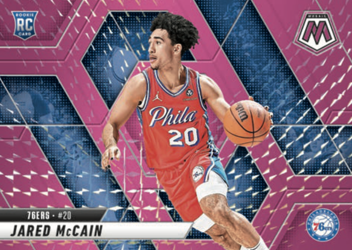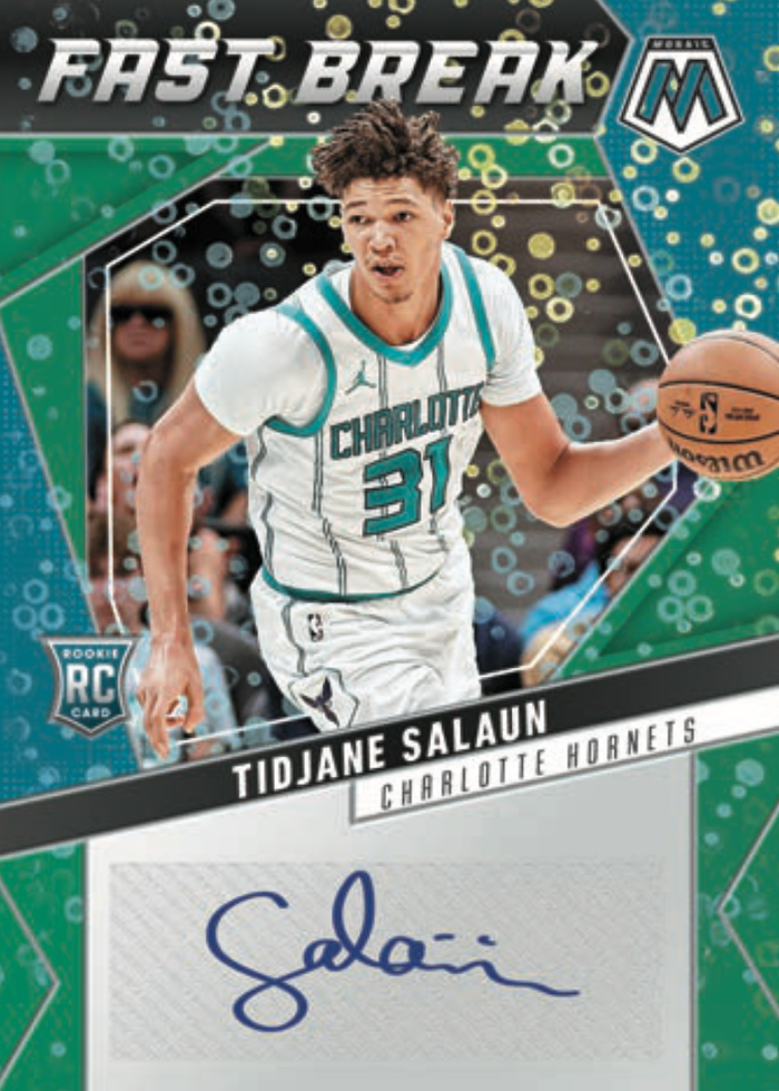 The Basics: You'll find 18 Prizms and six more inserts per hobby box here. ... Base parallels were not broken down in advance in full for the base set, but among them will be some new looks along with the basics -- Mosaic Honeycomb, Orange (/249), Bronze (/75), Purple Snakeskin (/24), Tessellation (/15) and Gold Snakeskin (/8) will be in there for starters. ... Subsets in the base set will include NBA Debut, City Edition and NBA Greats, while inserts will include Heat Check, Storm Chasers, NBA Cup, Overdrive and Razzle Dazzle as well as "SSP" Stained Glass, Micro Mosaic and Color Blast cards. ... Among the auto sets here will be Mosaic veterans, Mosaic rookies, Pictographs, Collage and Showtime Signatures. Joining them will be new Rookie Season Ticket, Rookie Variation Season Ticket, Veteran Ticket, rookie jersey autos (with Logoman cards in that mix) and Colorgraphs. ... Boxes once again carry a suggested retail price of $275.