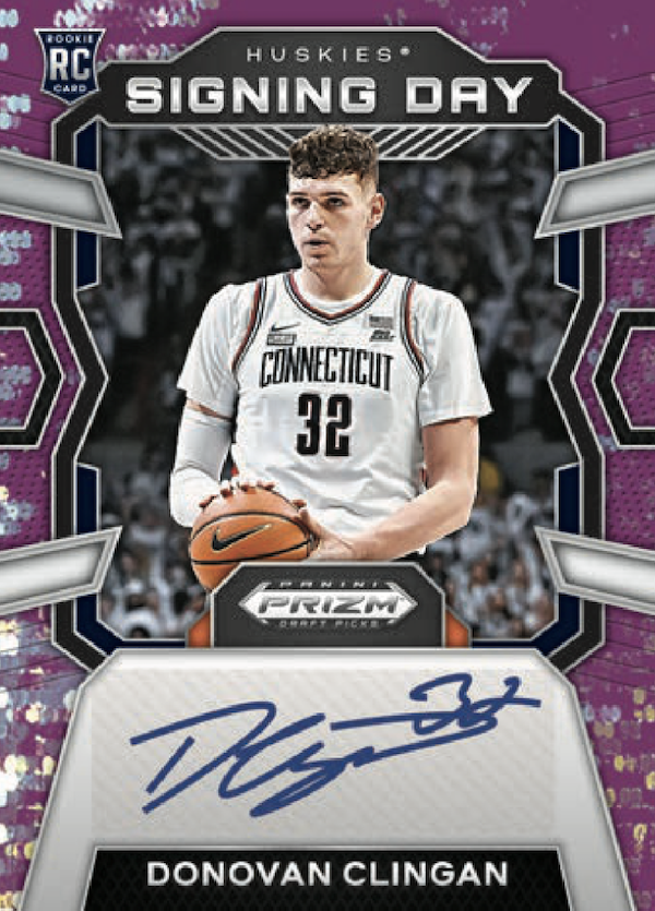 Update (Jan. 29): There will be six-pack hobby blaster boxes for this one (20 boxes per case, five cards per pack). They'll include three Green Wave Prizms, three other Prizms and then six inserts. Autos will have Purple Pulsar parallels (/15) for the Signing Day and Draft Signatures sets. Also in play will be blaster-exclusive Purple Pulsar (/55) parallel, while "retail-exclusive SSP inserts" Black Color Blast and High Voltage cards also were teased along with Nebula parallels