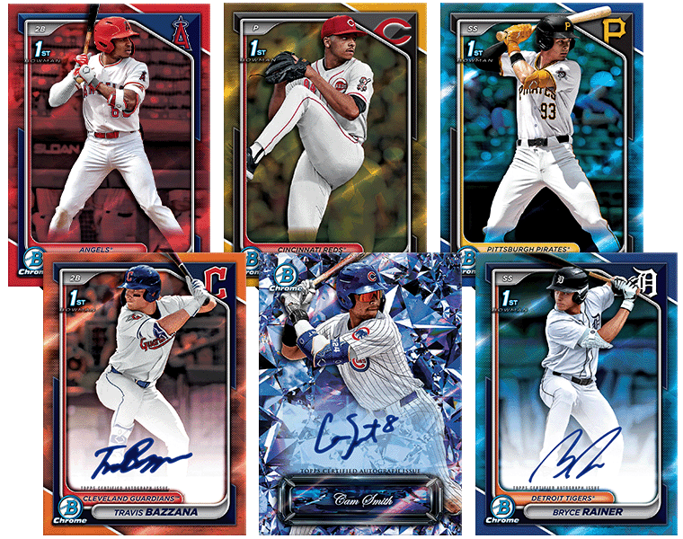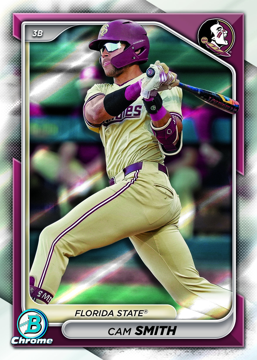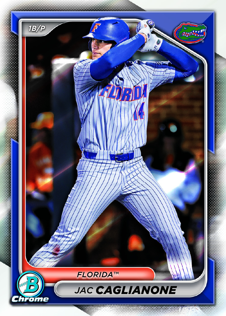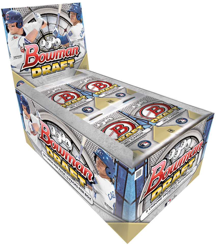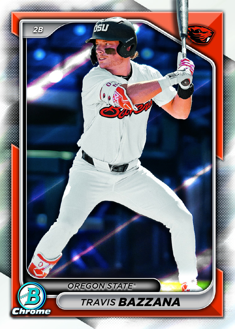 The Basics: Based on the checklist (link above), the base set will be 200 cards once again and they will be joined by Chrome parallels at the same set size. Among the inserts will be Etched In Glass variations, Final Draft, In Tune, Plasma Power, Bowman In Action, image variations, Prospectors Special die-cut variations, Draft Night, Spotlights, and college variations cards for 10 players. For autographs, there are prospect variations, dual prospect cards, Draft Prospect Portraits, In Action, Class of 2024, image variations, Plasma Power, Draft Night and prep all-star game autos.