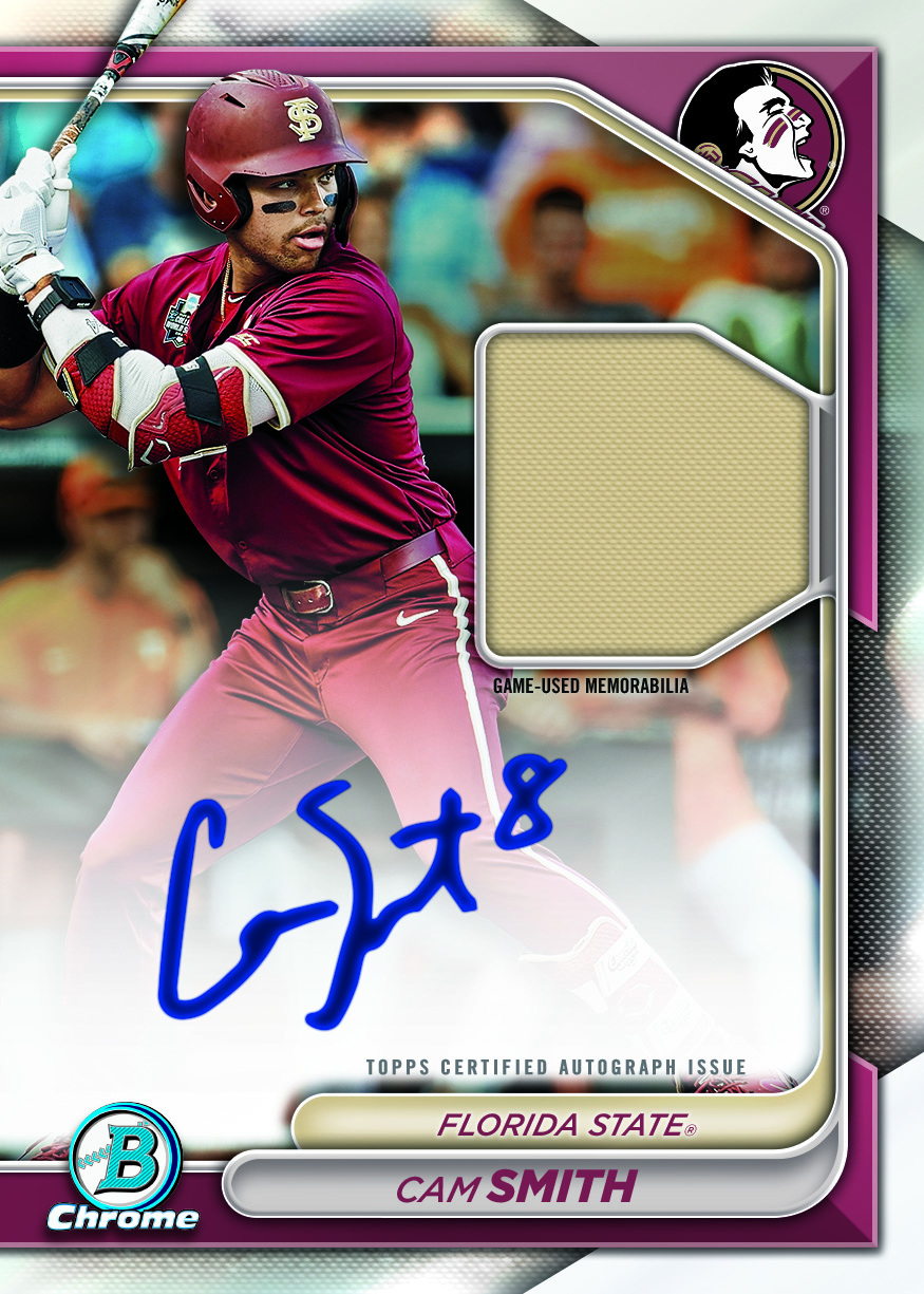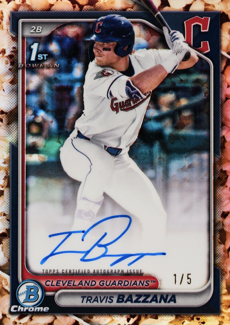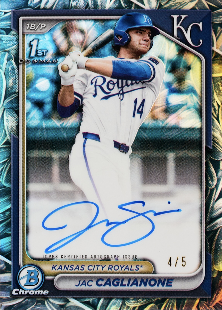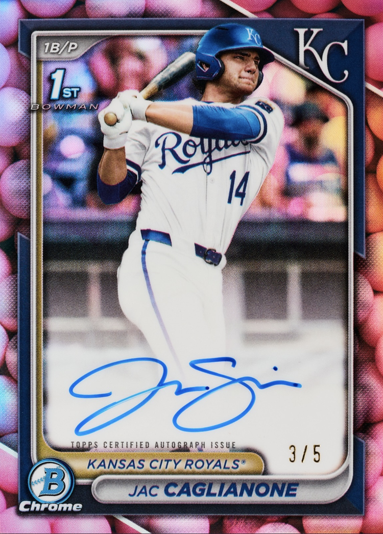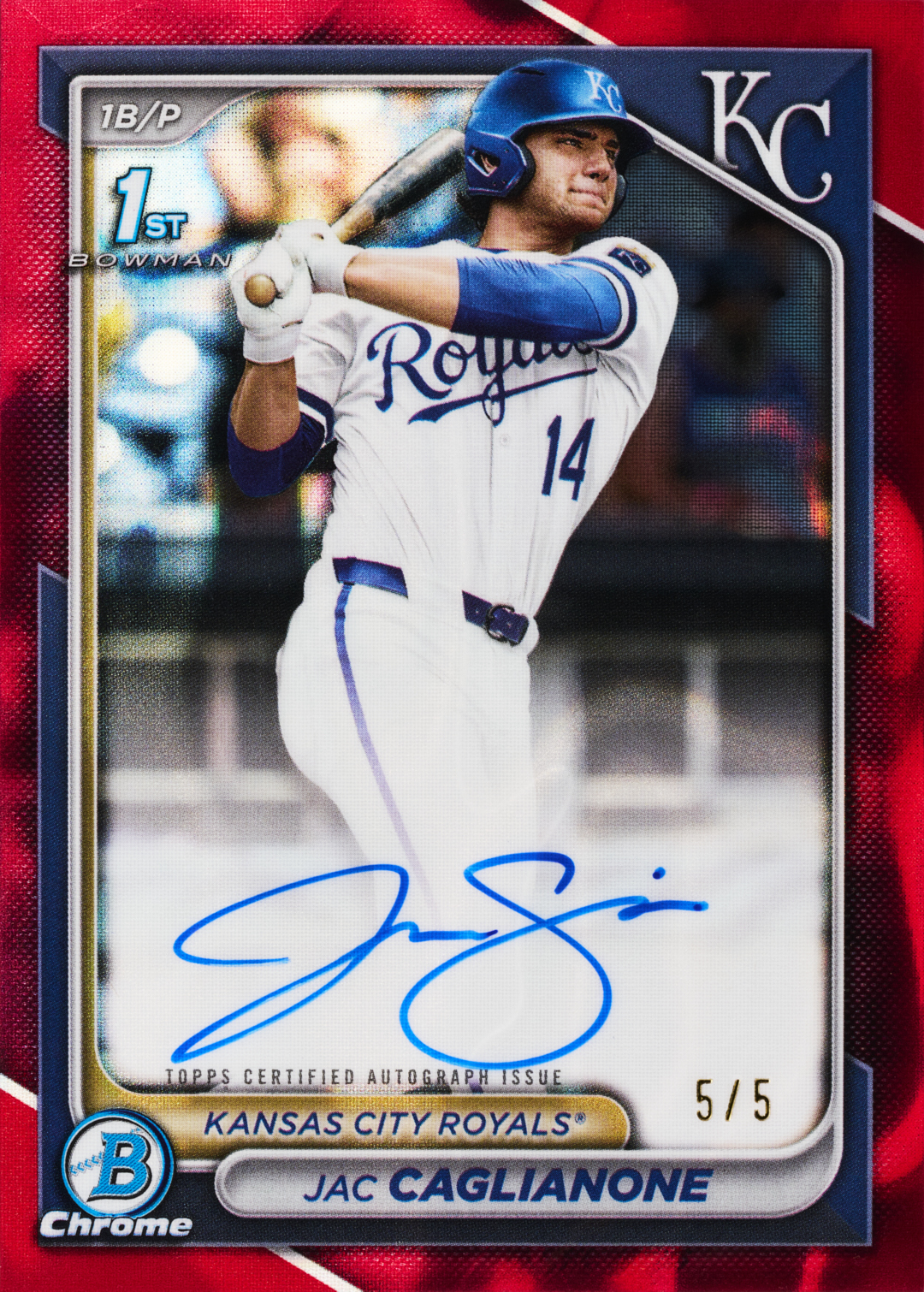 The Basics: Based on the checklist (link above), the base set will be 200 cards once again and they will be joined by Chrome parallels at the same set size. Among the inserts will be Etched In Glass variations, Final Draft, In Tune, Plasma Power, Bowman In Action, image variations, Prospectors Special die-cut variations, Draft Night, Spotlights, and college variations cards for 10 players. For autographs, there are prospect variations, dual prospect cards, Draft Prospect Portraits, In Action, Class of 2024, image variations, Plasma Power, Draft Night and prep all-star game autos.