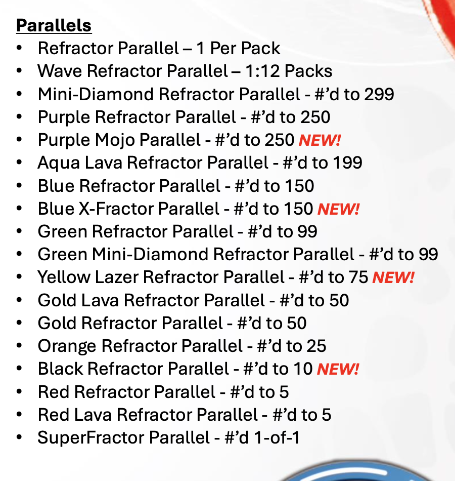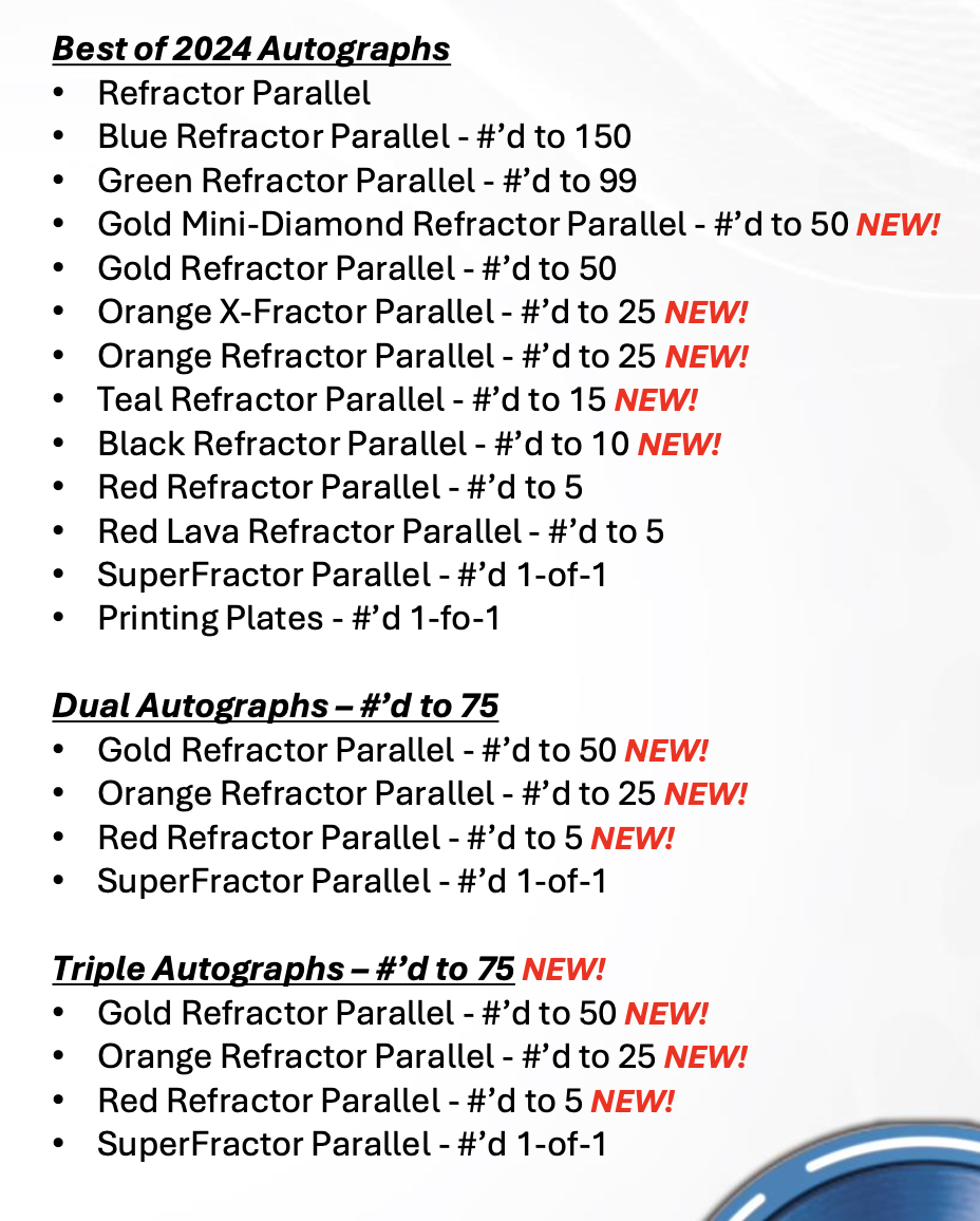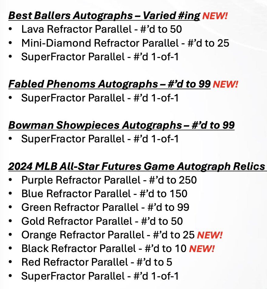 The Basics: There will be almost 20 parallels per card for the 100-card base set -- see the gallery -- featuring "the best superstar, rookies, and prospects from around baseball." ... Among the inserts will be 1955 Bowman Anime, 2024 MLB All-Star Futures Game, Strokes of Gold and Fabled Phenoms. The 1955s will have Black (/10), Red (/5) and 1/1 Supers for parallels, while the Phenoms will use a Mini-Diamond, Lava (/50) and Supers lineup. Futures will only have Lava and Supers, while Strokes will not be paralleled at all. The Mini-Lava-Super lineup also will apply for Impact Players, Best Sellers and Bowman Showpieces. ... For hits, there will be 11 autograph sets -- Best of 2024, duals, triples, quads, Family Tree duals and triples, Impact Players, Best Ballers, Fabled Phenoms, Bowman Showpieces and All-Star Futures Game Auto Relics. Parallel lineups for all can be seen in the gallery.