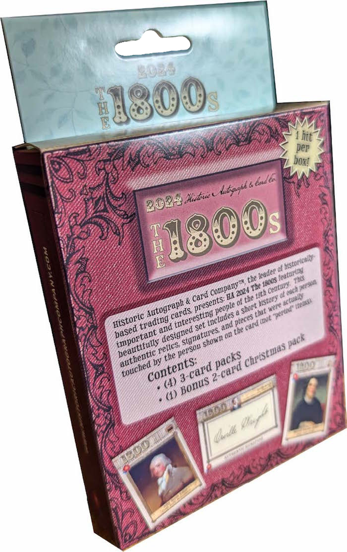 The Basics: Each box will include four three-card packs and one two-card Christmas pack that includes parallels as this one features "important and interesting people of the 19th century." ... Among the hits here are personally handled document relics for notable names, fabric relics and cut autos. Also in the mix will be Christmas chrome cards. ... Among the cut auto names are Thomas Nast, DeWitt Clinton, Admiral George Dewey, Oliver Wendell Holmes, Moe Howard, Henry Wadsworth Longfellow, Branch Rickey, William “Boss” Tweed and Orville Wright.