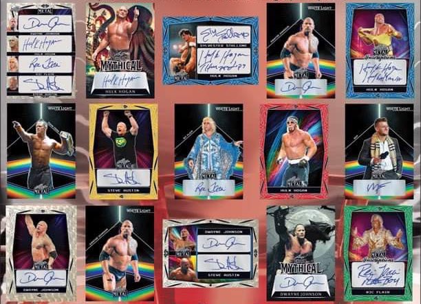 The Basics: Parallel and set details were not teased in advance for this one, but there will be a little of both in play here as all cards are limited to no more than 10 copies throughout the release. There also will be ink from stars in other realms who have set foot in a ring to be found here -- Shaquille O'Neal, Floyd Mayweather and Sylvester Stallone -- joining the likes of Hulk Hogan, Steve Austin, Ric Flair, John Cena and a current day superstar, Maxwell Jacob Friedman aka MJF, for starters. ... Among the inclusions here are Mythical autos, dual autos -- some with inscriptions and other multi-signed finds along with rarer White Light (/3) inserts that will only have 1/1 autograph parallels.