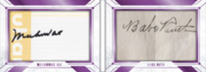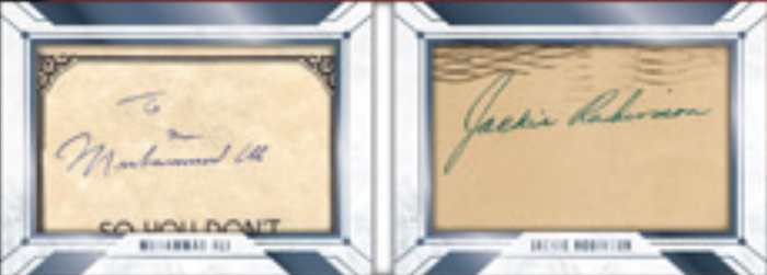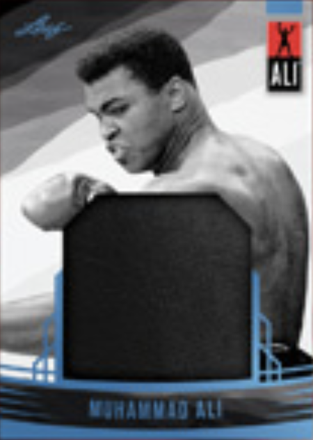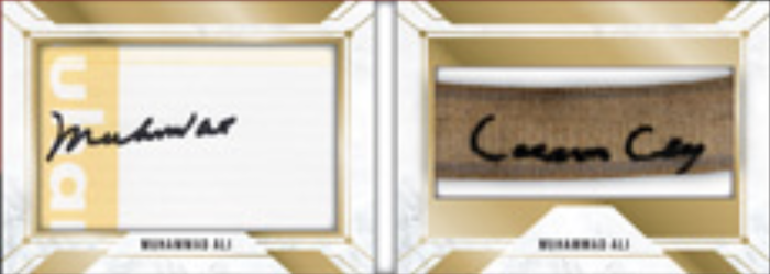 The Basics: Boxes will include one cut auto (/3 max), a pair of fight-used or training-worn memorabilia cards and 15 Metal or acetate-stock cards as part of a release that Leaf dubs as "super limited." Extensive details were not released for this one but there will be dual-cut booklets pairing Ali with other notables such as Jackie Robinson and Babe Ruth as well as himself as Cassius Clay. Also in there will be jumbo memorabilia cards as well as multi-piece, multi-item memorabilia cards as well as standard cut autos. Parallel foil colors also will apparently be in play but were not detailed in advance for this one.