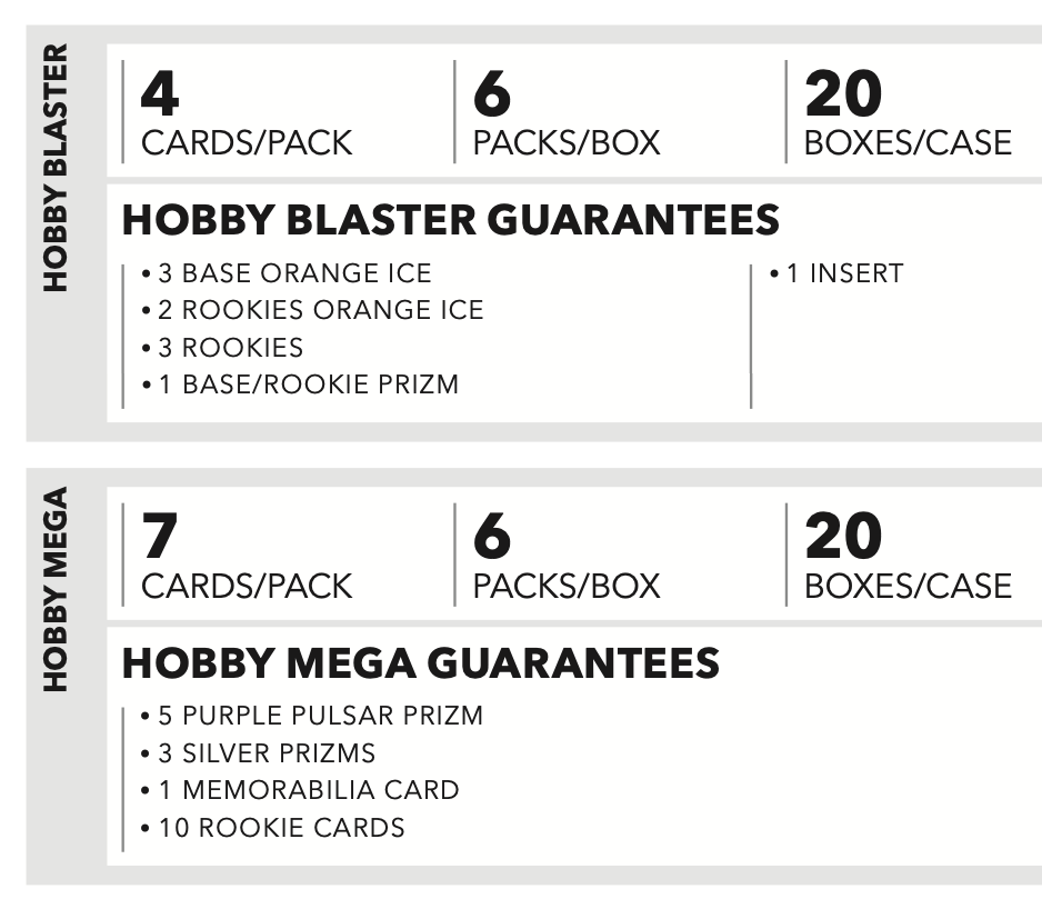 Update (Jan. 13): There will be hobby blaster boxes and hobby mega boxes for this one with exclusive inclusions for both (see gallery). that include Orange Ice and Purple Pulsar cards. Both will include six packs per box with megas having more cards per pack and a guaranteed memorabilia card each time.