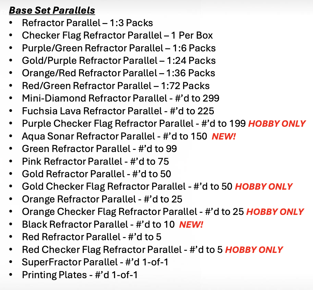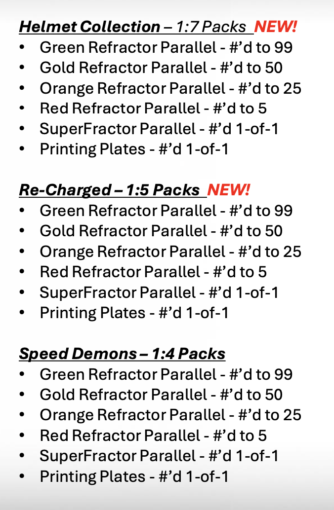 Box basics: 12 eight-card packs per hobby box (12 boxes per case) or 16 four-card packs per Qualifying Lap box (20 boxes per case)