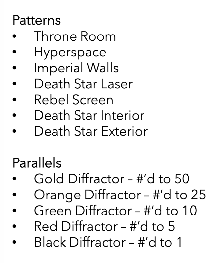 The Basics: The set is 100 cards with seven patterns apiece and then five parallels atop that -- details in the gallery -- while there will be other chase parallels and inserts to be found, too. Those will include Black & White variations, Black & White parallels with a 1/1 Black Diffractor, Wookiee-Tek, Spectacular Species, Shadow-Tek and Fantas-Tek. These will have Green (/10), Red (/5) and 1/1 Black parallels. ... Autographs will include standard cards with Orange (/25), Green (/10), Red (/5) and 1/1 Black versions as well and the dual-auto cards will only have Green, Red and Black versions to chase. Also in play will be double-sided dual-auto cards (Red and Black parallels there) along with Black & White autos and a Black Diffractor they're only parallel. ... A selection of 1/1 sketch cards also will be found. ... The characters are from throughout all eras of the Star Wars franchise.