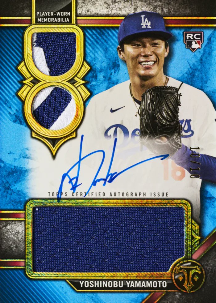 The Basics: A box will include eight base cards and two parallel cards (/199 or less) along with the four hits. The base set is larger at 200 cards with past and present stars included. ... Among the hits will be rookie and Future Phenoms auto Relics, auto Relics, auto Relic combos, auto Relic combo booklets, letter plus and jumbo plus auto Relic books, deca books, Windows Into Greatness auto Relic books, Common Threads triple auto Relics, Touch 'Em All and more that can all be seen at the checklist link above. Among the cut autos in this one? Babe Ruth, Hank Aaron, Willie Mays, Honus Wagner, Roberto Clemente, Rogers Hornsby, Tris Speaker and Ted Williams.