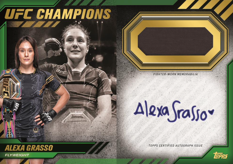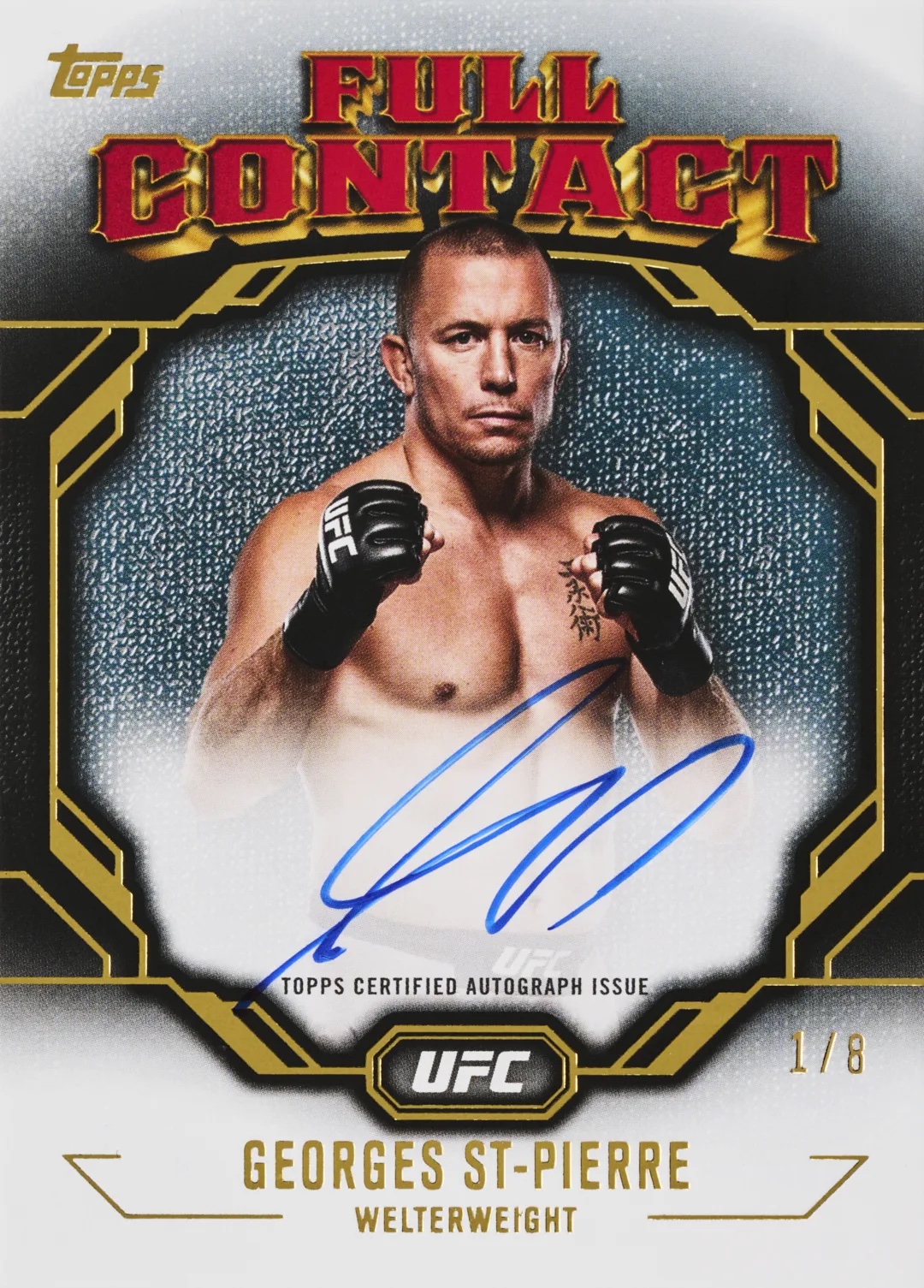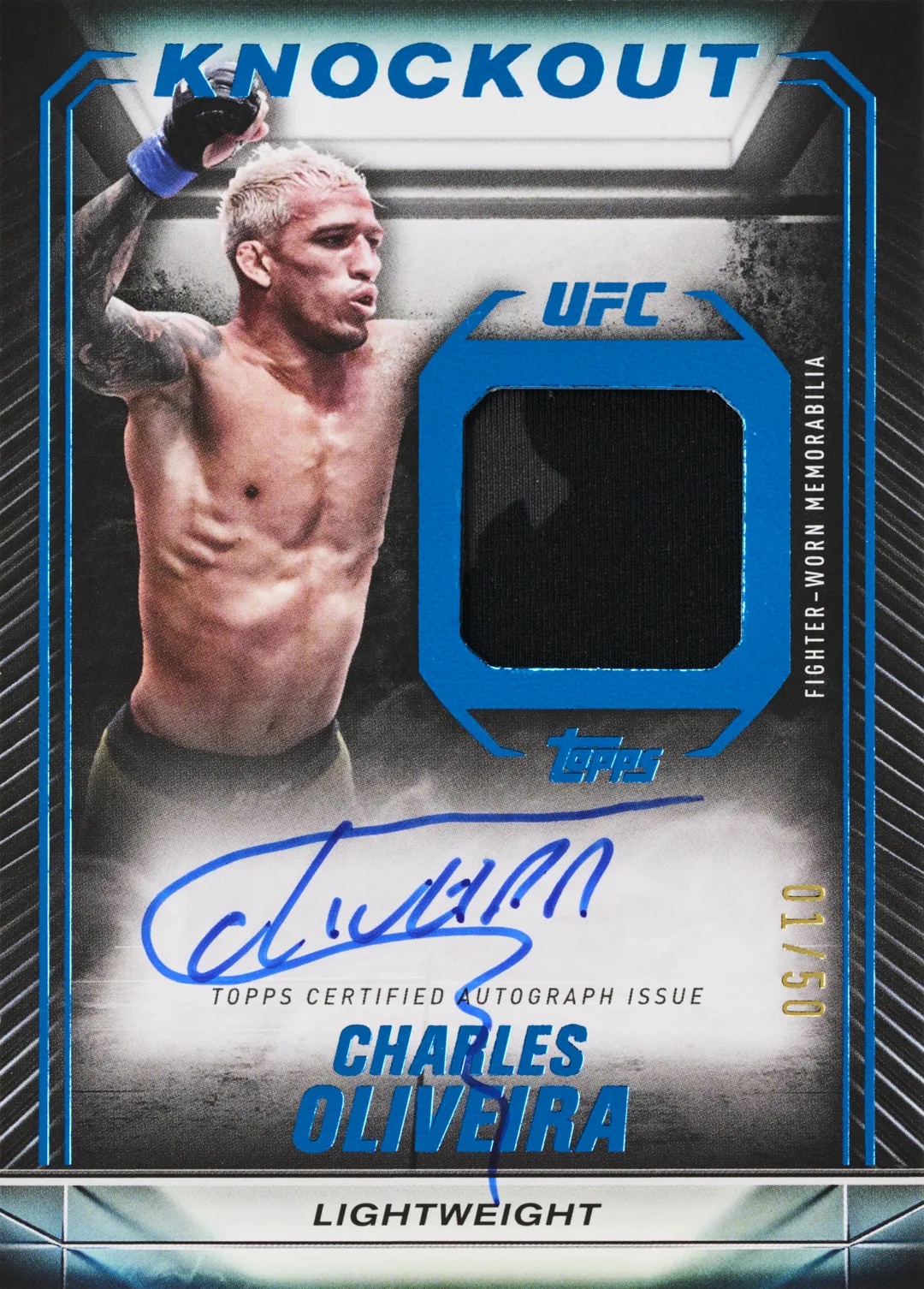 The Basics: Each 40-card box will include a trio of numbered inserts and four other inserts atop the hits. The 100-card base set will have Orange, Bronze (/250), Silver (/125), Purple (/99), Blue (/50), Red (/25), Black (/10), Gold (/8), Emerald (/5) and 1/1 Platinum parallels for all cards. ... Collectors can find five insert sets in this one -- Lights, Camera, Action, Inside The Octagon and Craftmasters -- with all of these found one in seven pack with Purple (/99), Blue (/50), Red (/25), Black (/10), Gold (/8), Emerald (/5) and 1/1 Platinum parallels. ... Autographs will be found in Knockout, Attested, Octagon Warriors, Full Contract and then dual- (/25) and triple-auto (/10) sets. The insert autos are called "limited" and they'll have Blue, Red, Gold and Platinum parallels at the same volumes as other sets. Joining them will be AKA Ink, Gallery Graphs (/99 max) and Pillars Of The Octagon (/99 max) with smaller parallel lineups. Also in there will be From The Rafters booklet autos (/25). ... For auto Relics, there will be 1-2 Combos, Knockout and jumbo fight mats (all /199 max) with Blue, Red, Gold and Platinum versions to chase. There also will be Champions Relic books and a dual-auto jumbo Relic book with both of those limited to 10. ... Rounding things out will be five standard Relic sets -- Knockout, Knockout duals, Momentous Materials, jumbo fight mats and All-In. They'll all have Blue, Red, Gold and Platinum parallels.