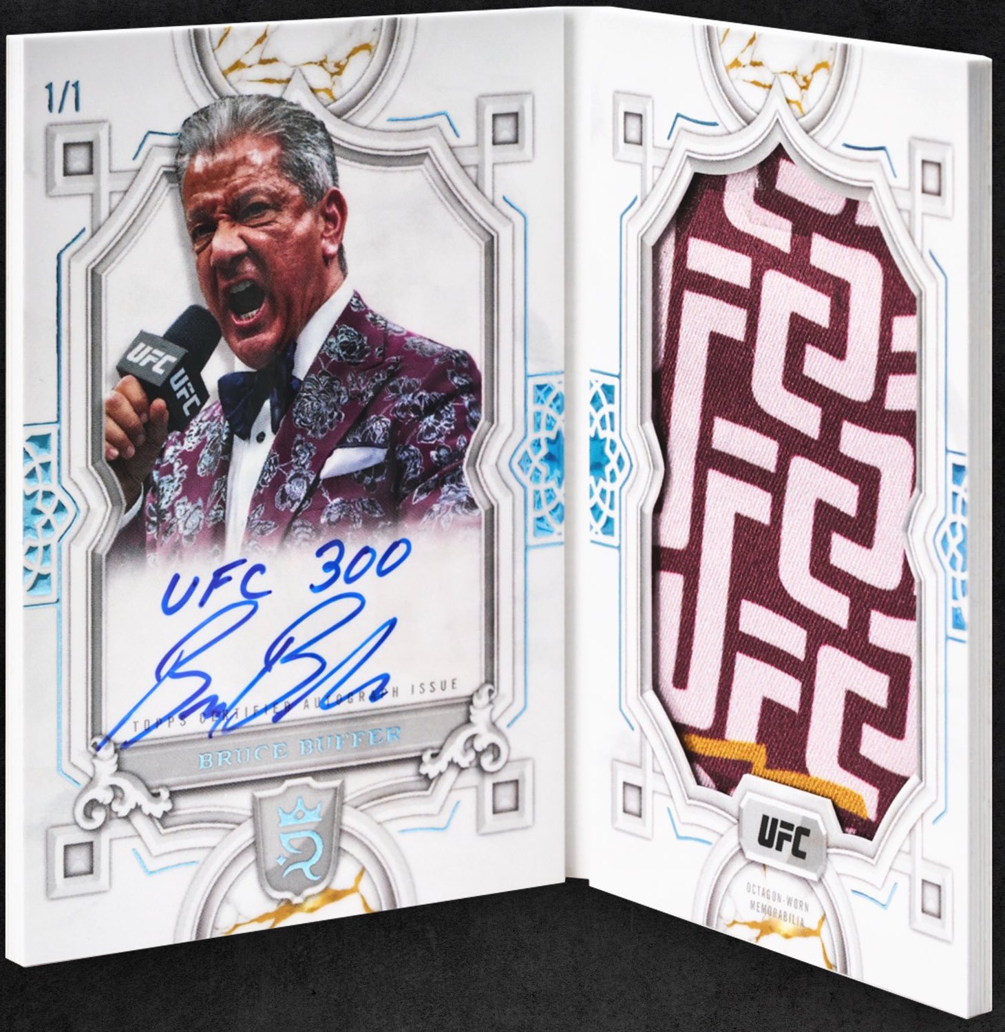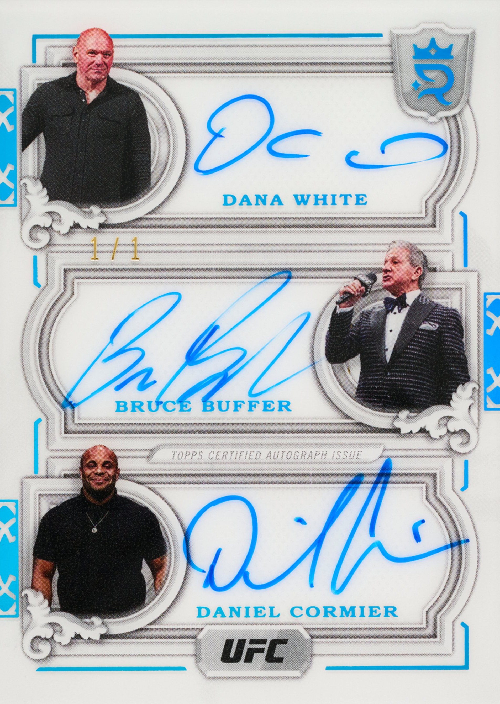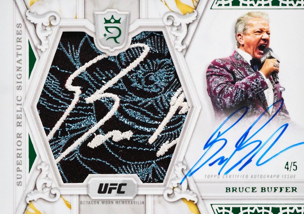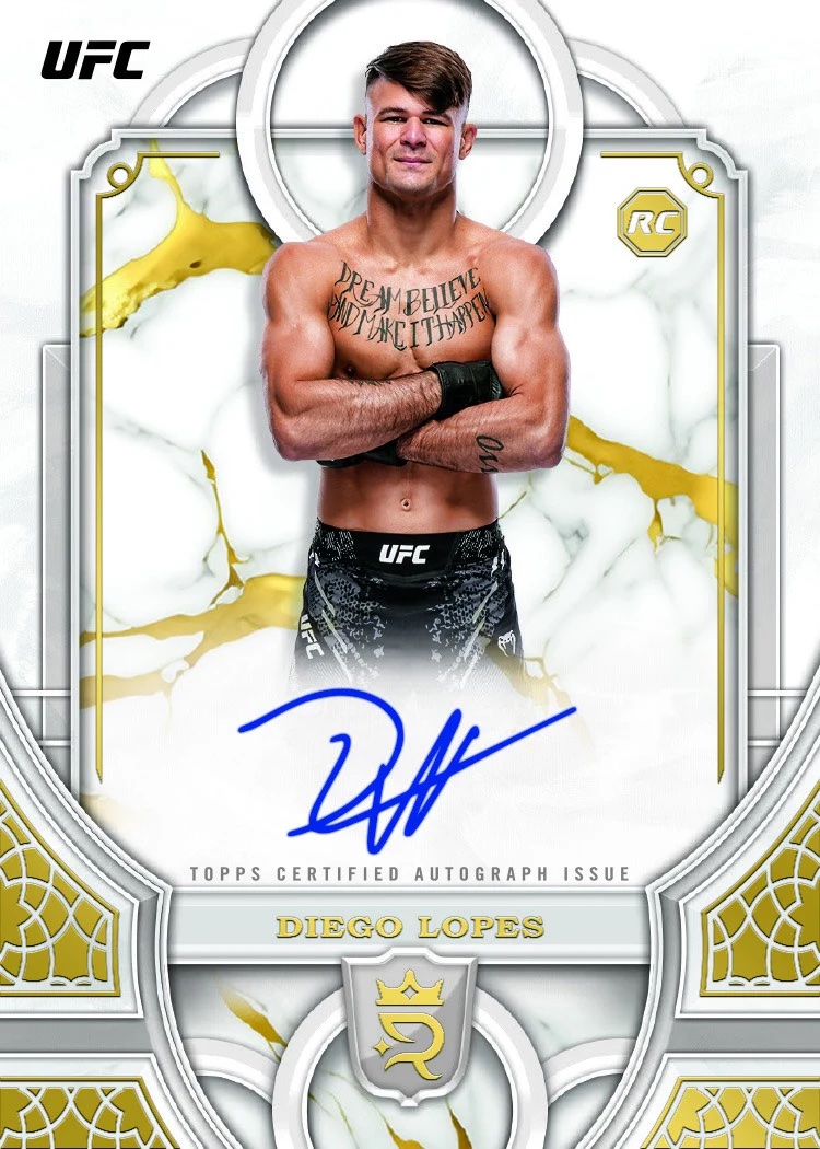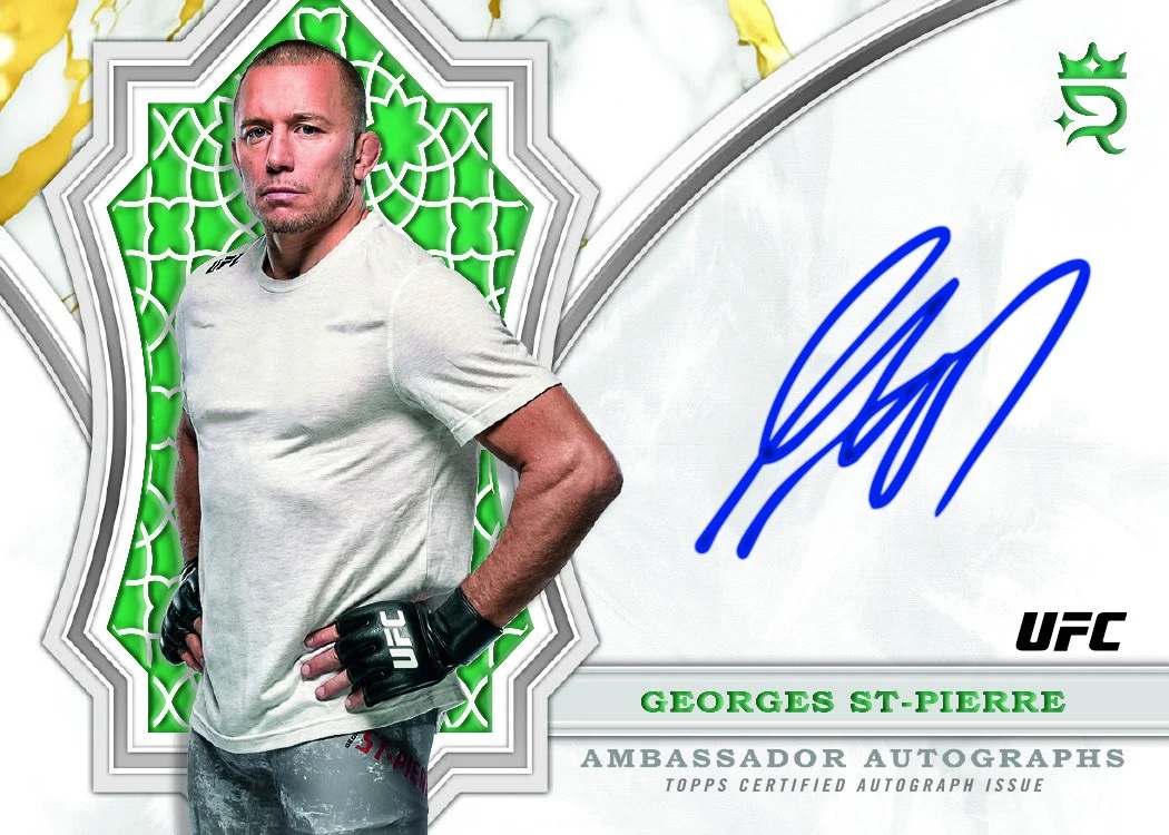 Autographed sets will include seven sets (all again /99, same parallels) -- rookies, Imperial Ink, Ambassadors, Superioer Signatures, Pursuit of Greatness, Influential Ink and Golden Hall. Joining them -- but without parallels or fewer options -- will be UFC Honors, duals, triples, The Coronation, Royal Decree and The Time Is Now. The first three sets are (/25) with only a 1/1 Platinum to chase, while the last three will have Blue (/25) parallels only.