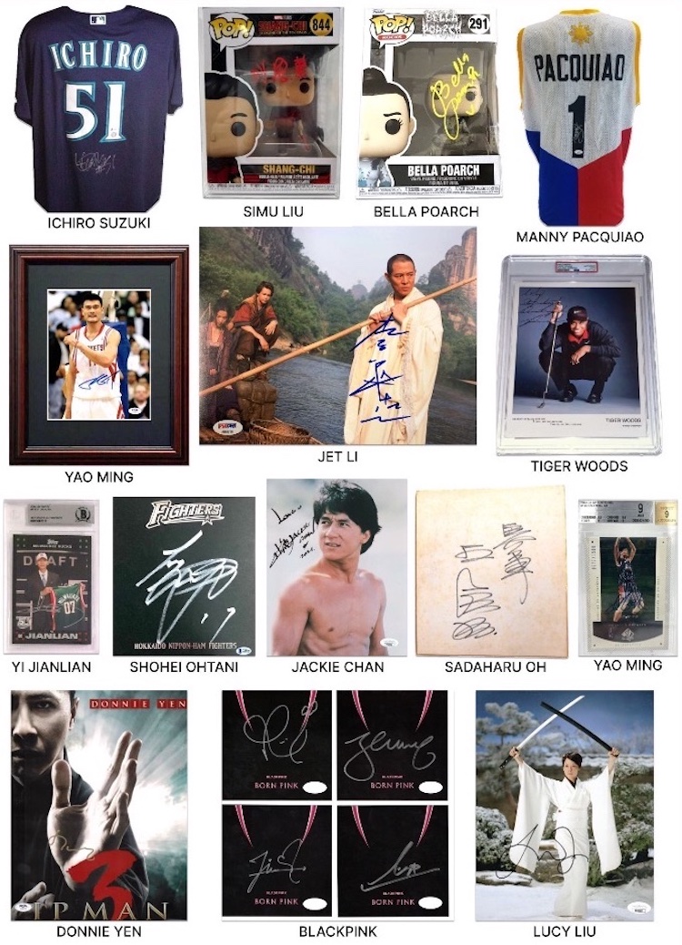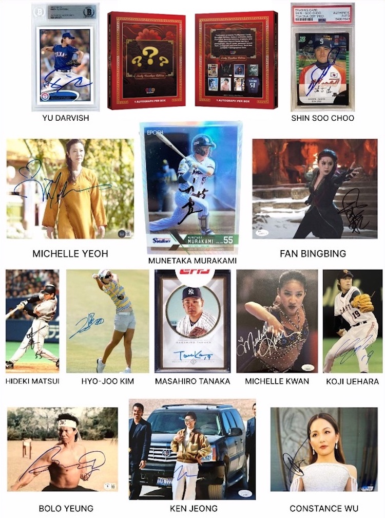 The Basics: There will be signed photos, jerseys, cards, vinyl albums, Funko Pop! toys, balls and more in play here with the premium pieces that won't fit into a flat box being redemption items that will ship free once redeemed. Some of the teased names here include Yao Ming, Jet Li, Jackie Chan, Tiger Woods, Ichiro Suzuki, Yi Jianlian, Shohei Ohtani, Sadaharu Oh, Hideki Matsui, Donnie Yen, BLACKPINK, Lucy Liu, Hideo Nomo, Tony Jaa, Henry Golding, Psy, Shin-Soo Choo, Simu Liu, Yu Darvish, Munetaka Murakami, Michelle Yeoh, Fan Bingbing, Masahiro Tanaka, Bolo Yeung and Ken Jeong among others who you can see in the gallery below. ... According to the company, more than half of the boxes will include signed cards and there also will be randomly inserted "world subjects" who are popular with collectors around the globe such as Stephon Marbury, Dwyane Wade, Ronaldo, Shai Gilgeous-Alexander, Anthony Edwards, Erling Haaland, David Beckham, Kobe Bryant and Tracy McGrady. ... Boxes will carry a suggested retail price of $140.