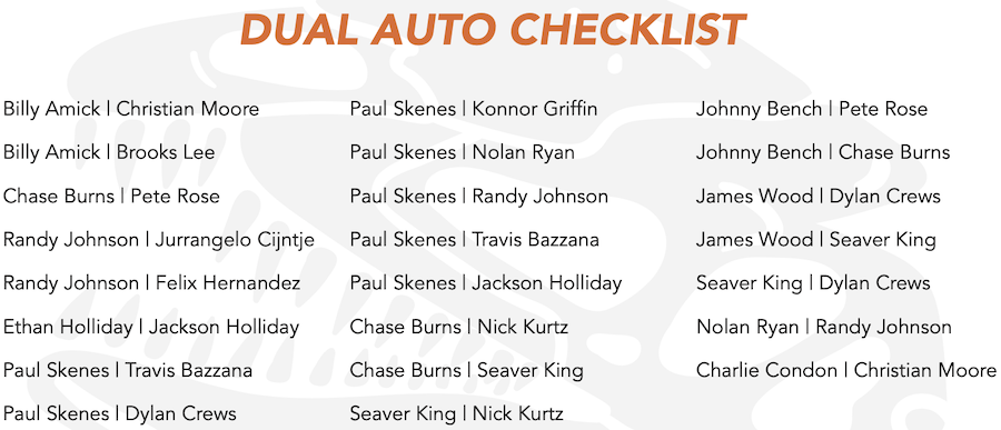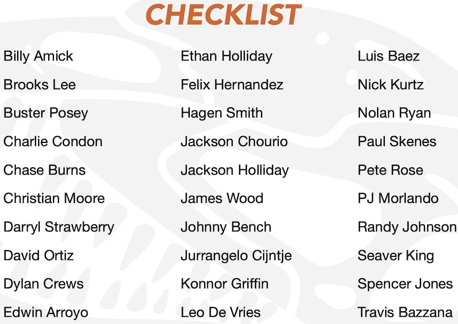 The Basics: Each box includes four cards with standard autos dropping every fourth box. All cards are numbered to no more than 25 copies in this one with four styles as seen above and in nine colors per card. ... Also in the mix here are Color Match True 1/1s -- signed and unsigned -- that arrive in every case unless a dual-auto cards is found. Those are one in five cases. ... Among the signers here are Paul Skenes, Nolan Ryan, Pete Rose, Randy Johnson, Johnny Bench, Travis Bazzana, Dylan Crews, Jackson Holiday, Ethan Holliday, Felix Hernandez, Nick Kurtz, Chase Burns, Charlie Condon and James Wood for starters. The full checklists can be seen below.