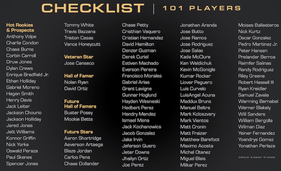 The Basics: Every auto in this one is numbered to no more than 25 copies with just over 100 signers on the checklist. There will be three different pack types here -- /25, /5 and 1/1 -- with those being the max volumes for what's found inside. There were five sets to be found here each with a rainbow of parallels (detailed below). The ink will include Matte, Rising Heat, Smoking Guns, Weekend Warrior and Xplode. ... Among the teased players here are Paul Skenes, Jackson Holliday, David Ortiz, Mookie Betts, Buster Posey, Corbin Carroll, Dylan Crews, Anthony Volpe, Ethan Holliday, Jack Leiter, Jackson Chourio, Jose Canseco, Nolan Ryan, Carlos Pena and a number of other players. See 'em all in the gallery.