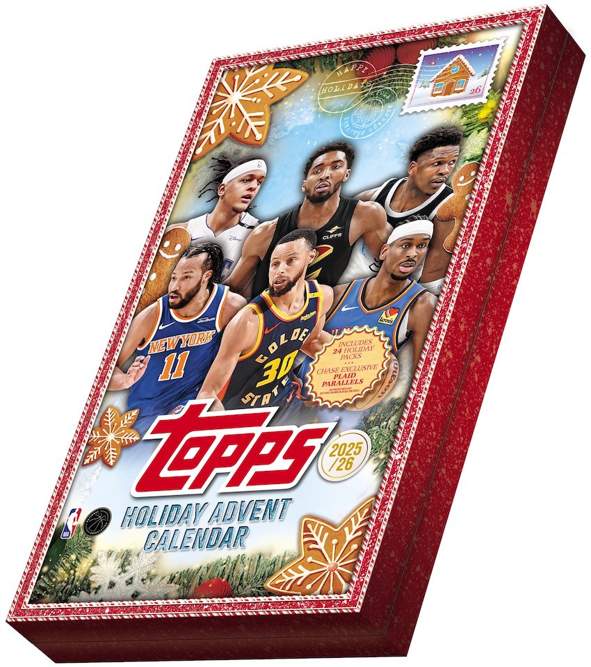 Update: Advent calendars will include 24 Holiday Plaid Base parallels, 20 Making the Nice List inserts and 4 Evergreen cards. Mega boxes will include six Holiday Glitter cards, one Holiday Blue Metallic Glitter, one Holiday Light Blue and White Glitter, one Holiday variation SSP or backs variation SSP) and one oversized die-cut ornament card.