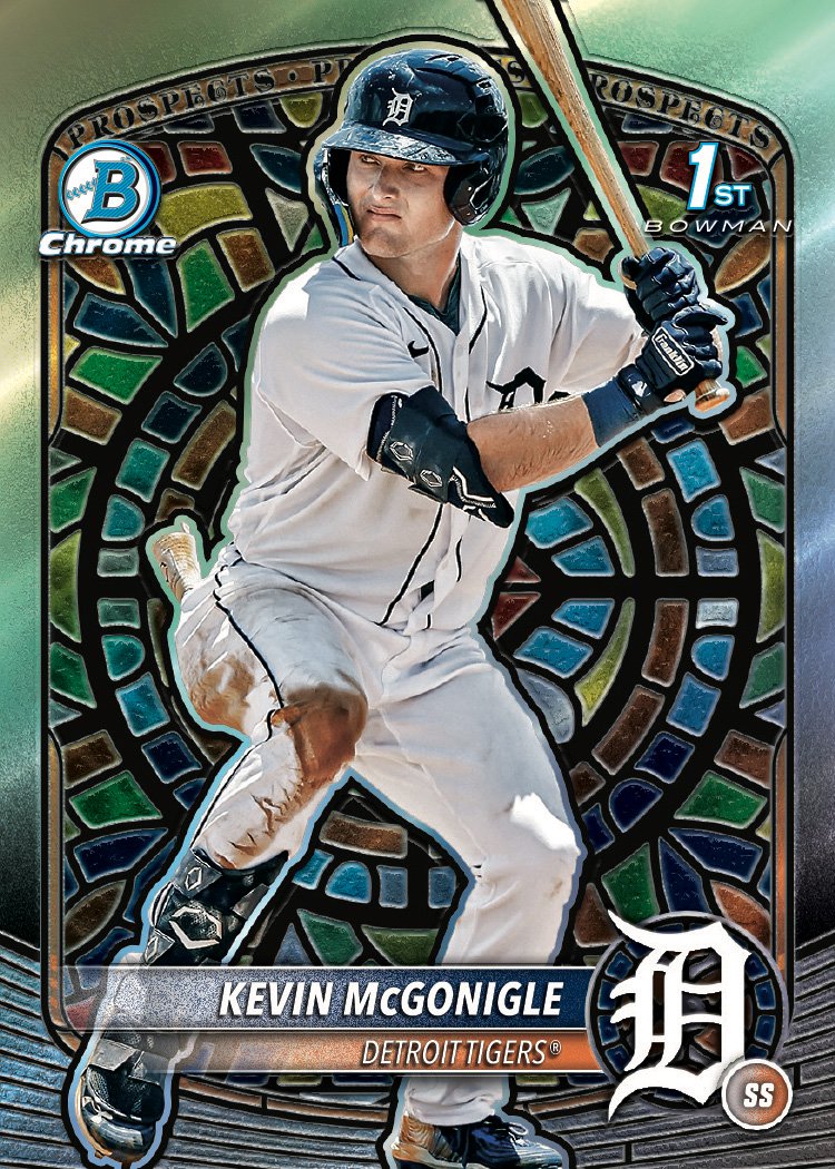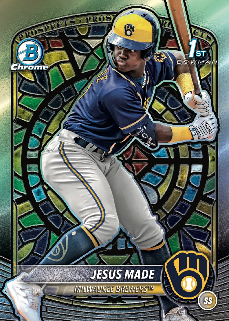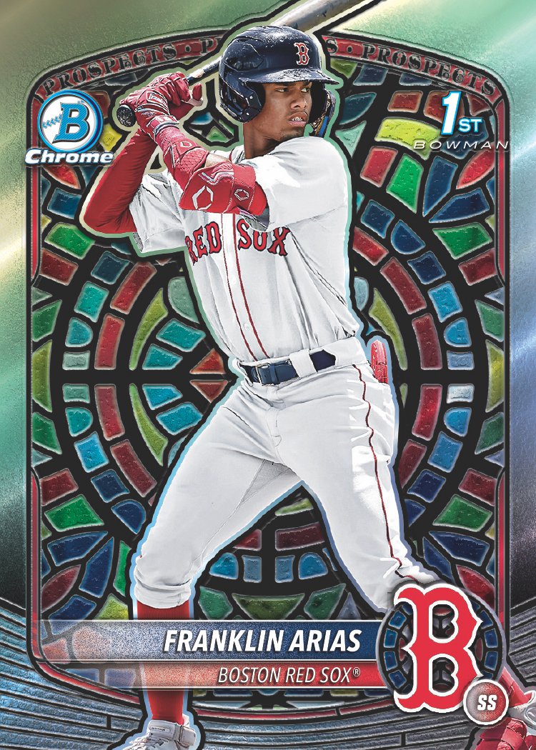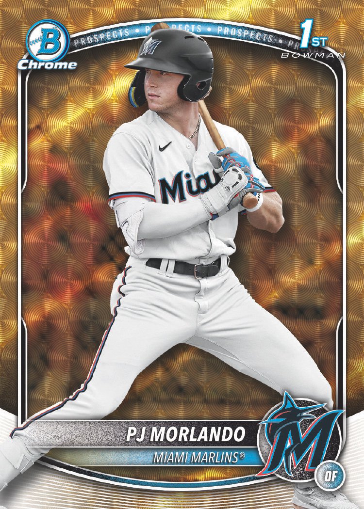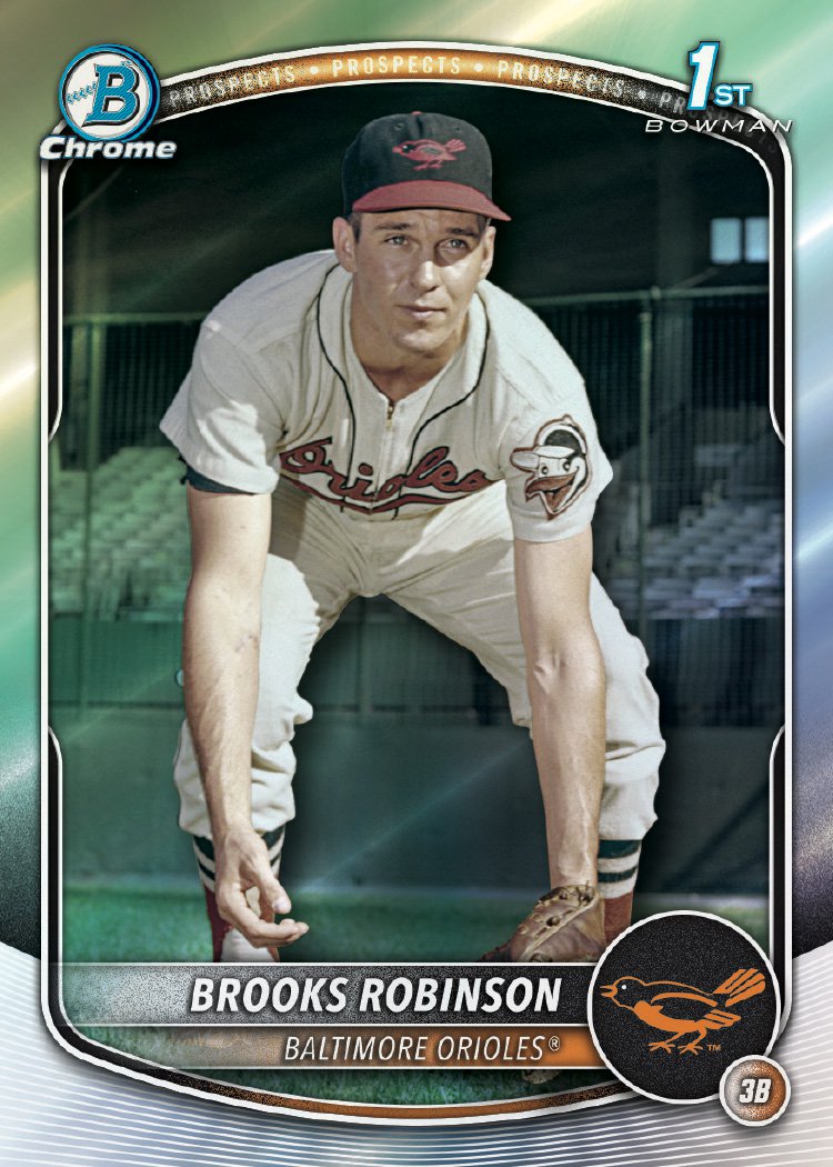 Update (April 9): The base set here will include 100 veterans and rookies, while the prospects set and its Chrome counterpart are 150 cards. A pair of Retrofractor variations will be found for Brooks Robinson and Steve Carlton in this one (see checklist link up top) and other finds will include Etched In Glass variations, Bowman Spotlights, Anime (some with Kanji variations), Bowman Scouts Top 100, ROY Favorites, Hobby Stars, Very Important Prospects, Rockstar Rookies, Crystalized and Greatness Loading. (See parallels in play on the odds file linked above.)