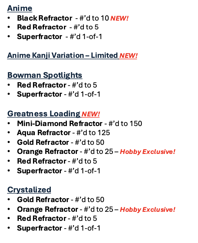 The Basics: There will, of course, be Chrome prospect autos, Anime inserts and Rookie Cards for newcomers such as Roki Sasaki. No other info has yet been released but this one will update when more info and images are formally unveiled.