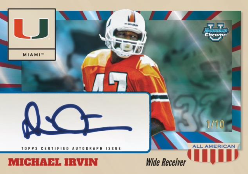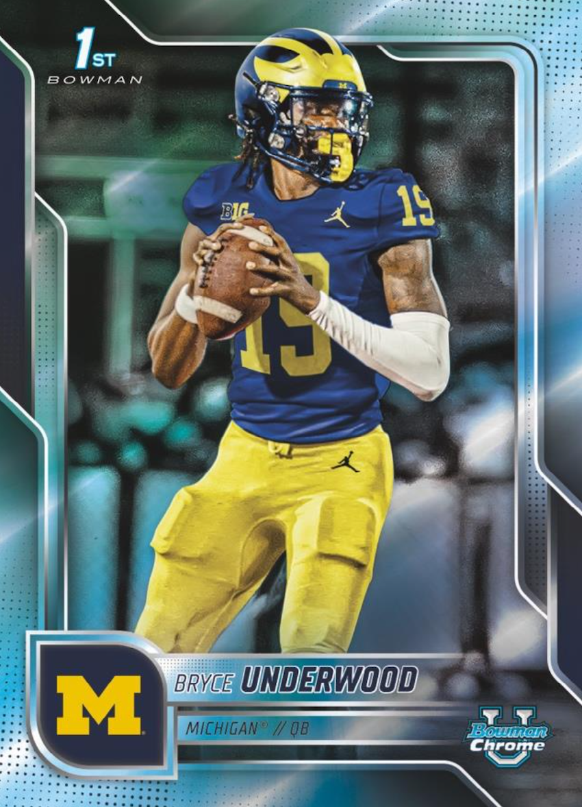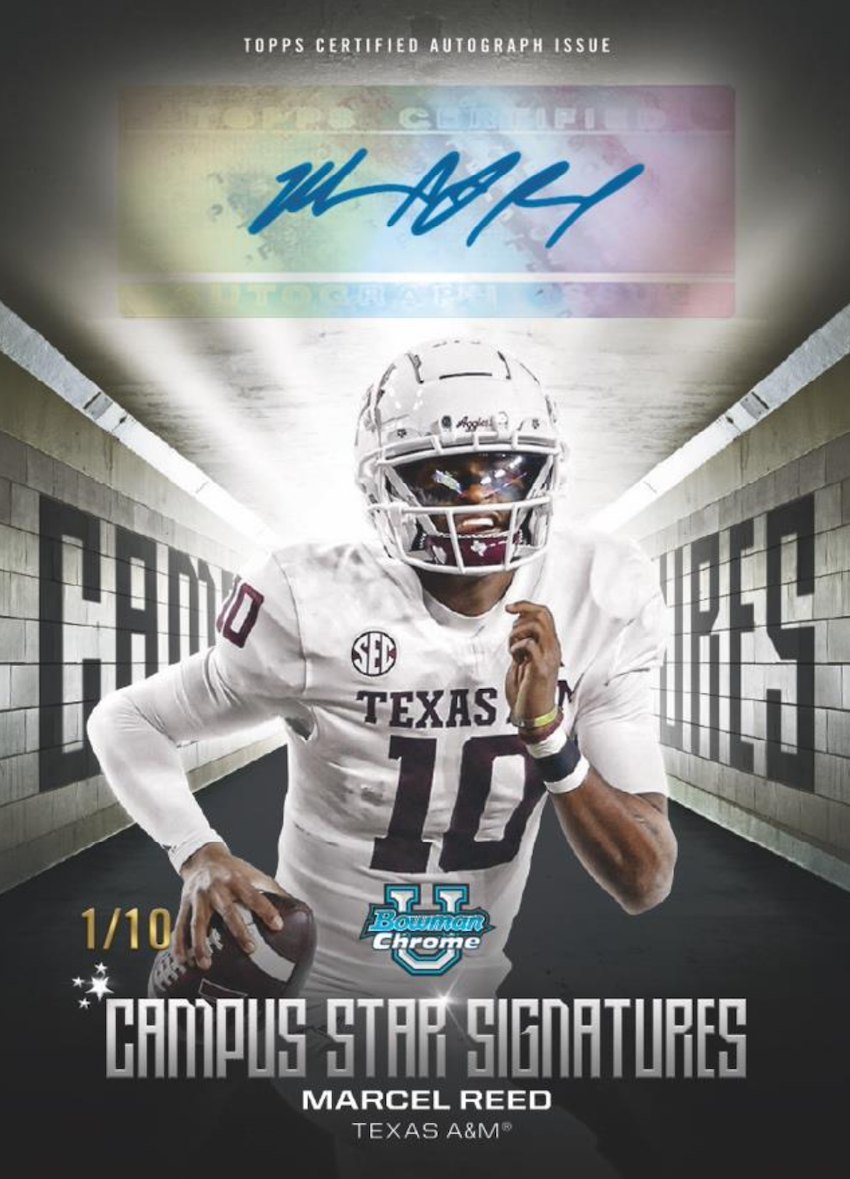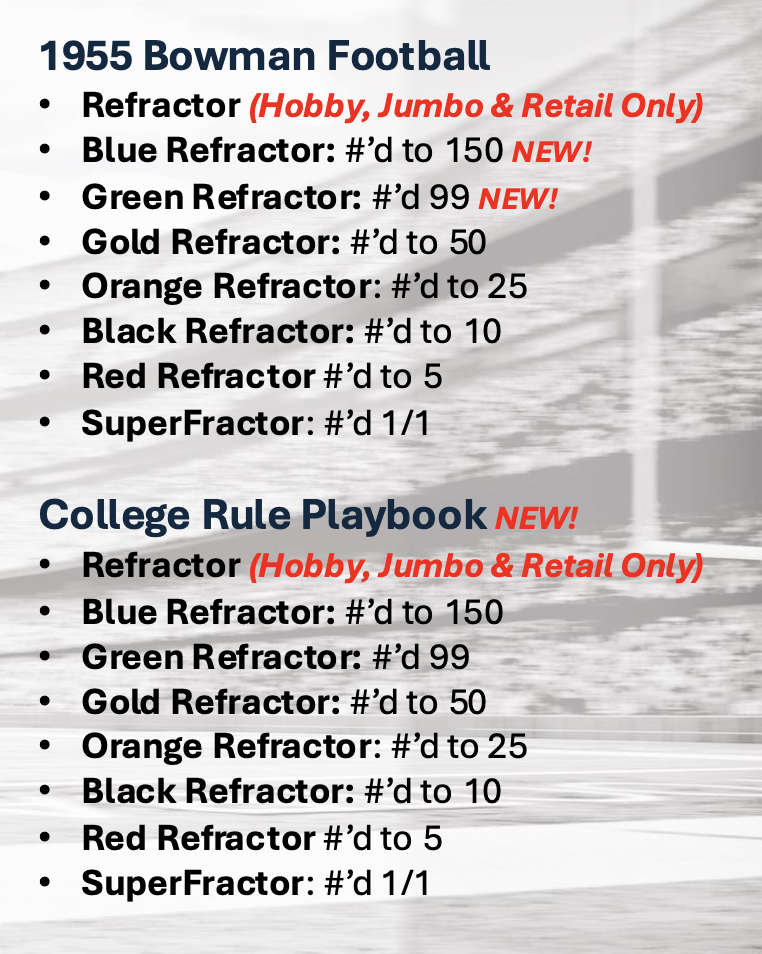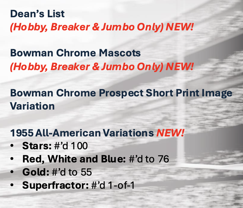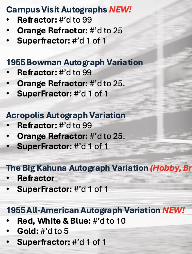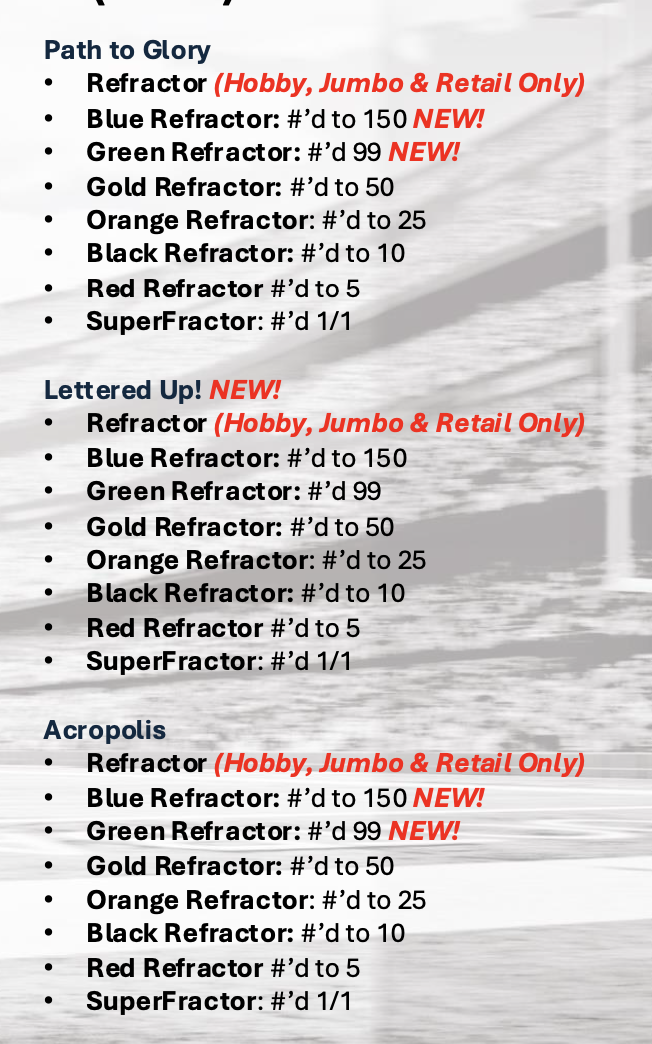 The Basics: The base set of this one will include 200 top current stars on Chrome stock and we've got some other early basics and teasers. Among the inserts will be image variations, College Rule Playbook, Path To Glory, Lettered Up! and Acropolis. Autographed sets will include Campus Visit, Campus Stars, a 1955 Topps All-American homage and Chrome prospects.