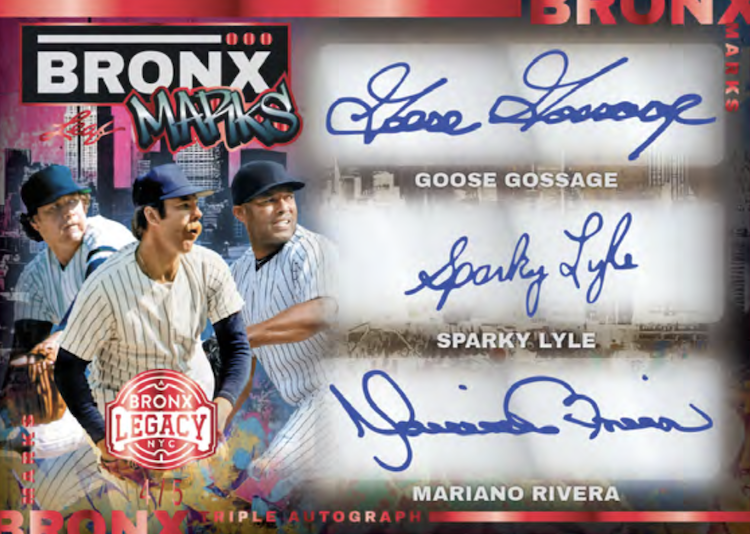 Among sets here will be Bronx Legacy autos (with triples and quads), Yankee Doodles inscriptions, Metal Inscriptions, Accolades, Big Apple Ink, Gotham Greats, October Legends with eight autographs, October Legends with eight memorabilia pieces, Bronx Marks duals and triples, Enshrined, A Piece In Time and Legacy auto-mem cards.