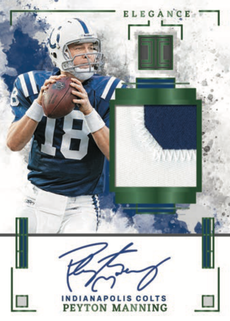 The Basics: Autos, a precious metal card and base cards or parallels (not detailed in advance) are all that will be found here -- some boxes with more ink than others -- but every box will include a rookie patch auto just like last year. ... Among the autographed cards will be Extravagance, Jersey Numbers, Immortal Ink, Stars Of The Fall, Masterstrokes, First Ballot Signatures Impressions and Elegance (Retired and Veteran sets). There also will be Elegance Helmet & Patch Autos "alongside some truly breathtaking autograph and memorabilia offerings." Also in there will be Inkpeccable Duos, Trios and Quads. ... Metal cards will include silver and gold cards in NFL Shield, Hall of Fame, Rookie NFL Shield and USA Flag sets. ... Boxes once again carry a suggested retail price of $850.