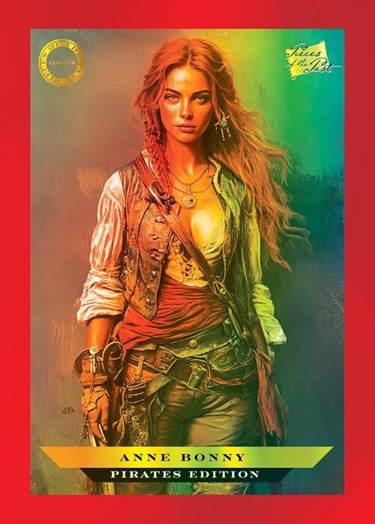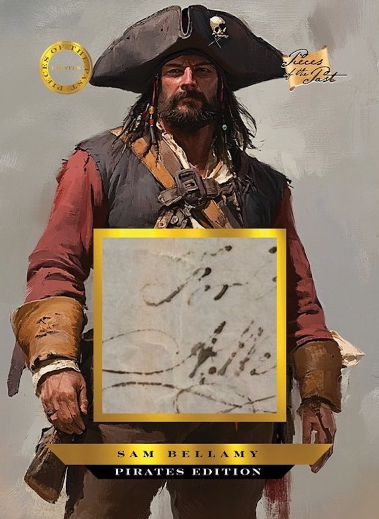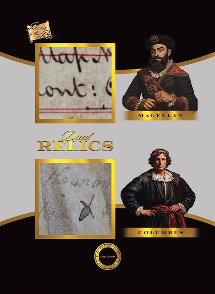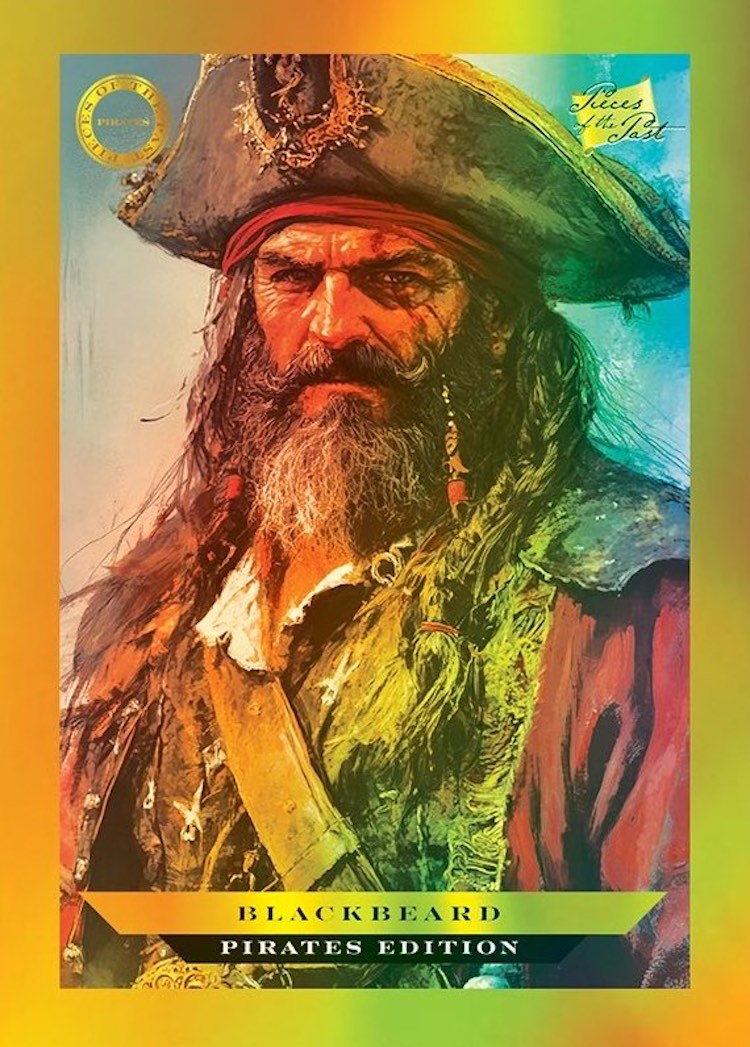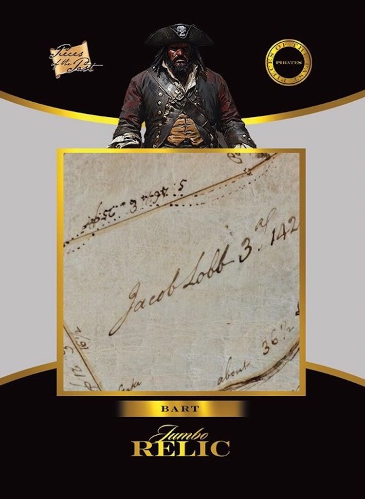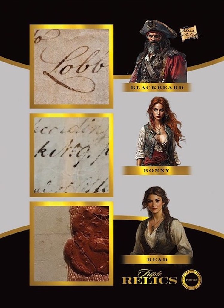 The Basics: All cards are made with a foilboard look with 60 base cards having Silver Rainbow, Red Rainbow (/50) and Gold Rainbow (/10) versions. There will be 100 relics to chase with singles, jumbos, duals, triples and quads among those finds and they will have Silver Rainbow and 1/1 Cracked Ice versions. All memorabilia pieces will be embedded into the card with handwriting samples, cut signatures, shipwreck items, pirate maps, original maps and ship manifests among the pieces used. ... Subjects include Blackbeard, Sir Francis Drake, Ferdinand Magellan, William Kidd, Marco Polo, Sam Bellamy, Anne Bonny, Henry Morgan, Black Bart, Edward Low, Mary Read, Charles Vane, Ching Shih and Christopher Columbus for starters. ... Regular boxes carry a suggested retail price of $79.95.