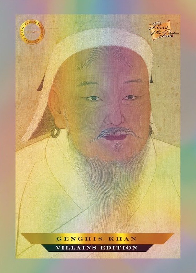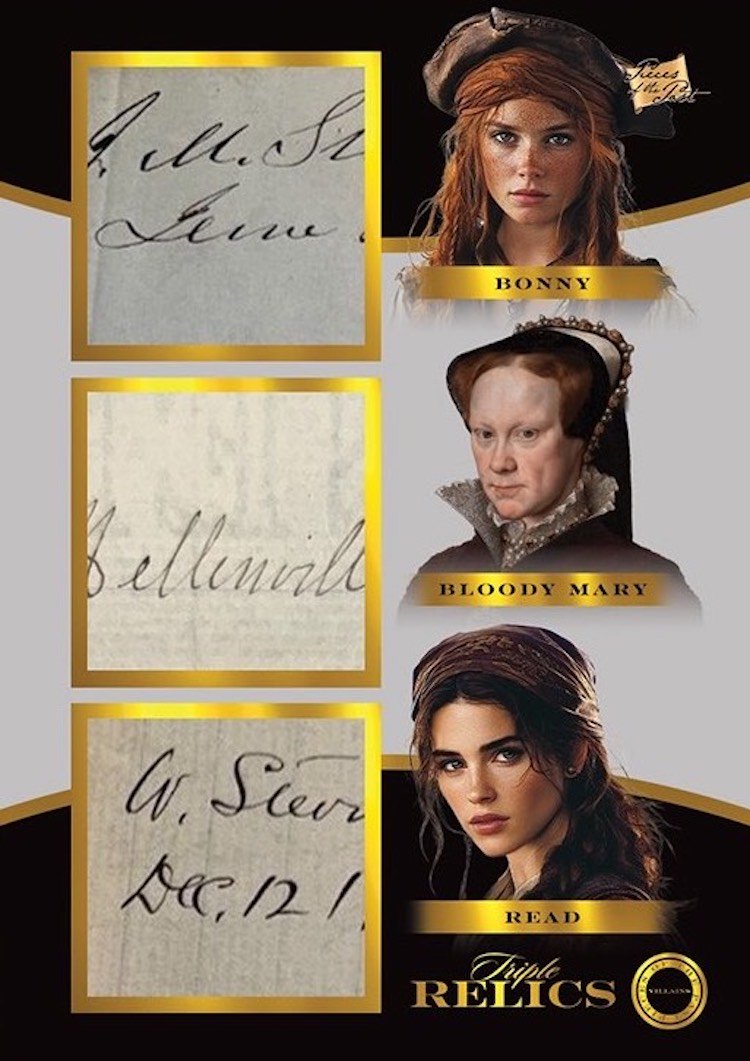 The Basics: Among those in this one are Julius Caesar, Al Capone, Genghis Khan, John Dillinger, Billy The Kid,, King Nebuchadnezzar, Nero, Alexander The Great, Attila The Hun, Blackbeard, Anne Bonny, Sir Francis Drake, Jesse James, Bonnie & Clyde, Marcus Brutus, Zheng Yi Sao and Hannibal for starters. Among the card types/memorabilia pieces in this one will be handwriting samples, cut autos, western/cowboy items, shipwreck items, maps, ship manufests and more. ... Base cards will be found in Rainbow, Red Rainbow (/50) and Gold Rainbow (/10) while Relics will have Rainbow and 1/1 Cracked Ice versions. All memorabilia pieces will be embedded into the cards for this one. ... Boxes carry a suggested retail price of $59.95.
