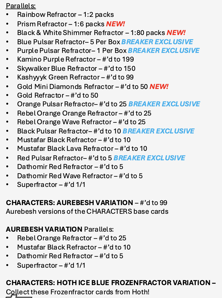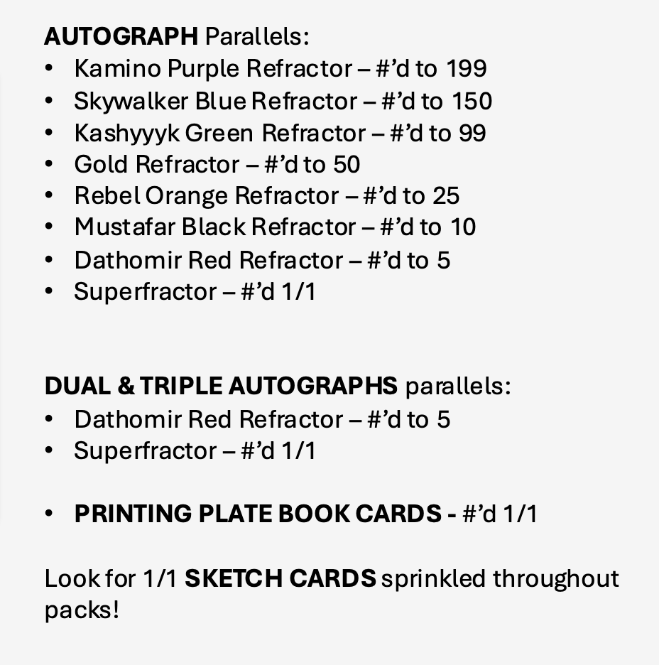 The parallel lineup here is meaty -- see gallery -- with 20 Refractor versions per card and then a Hoth Ice Frozenfractor atop that. There also will be Aurebesh variations (/99) for all 200 cares with four parallels of those. Among the other inserts are Skeleton Crew, Acolyte and Outerworld Oddities and each of these will have Green (/99), Gold (/50), Orange (/25), Black (/10), Red (/5) and 1/1 Superfractors to chase. Joining them will be Star Wars By The Number line art cards that can be colored, Galactic Graffiti -- with Mini-Diamonds (/50), Mojo (/25), X-Fractor (/10), Wave (/5) and 1/1 Supers -- along with a Tribute to '75, which meshes Star Wars with the 1975 Topps baseball design (/75) with a Superfractor version as well as inked versions. Rounding outage basic inserts will be Double Vision (/50) cards.