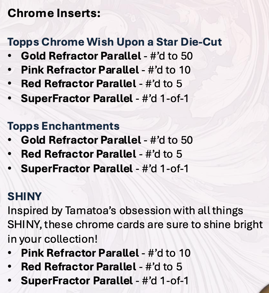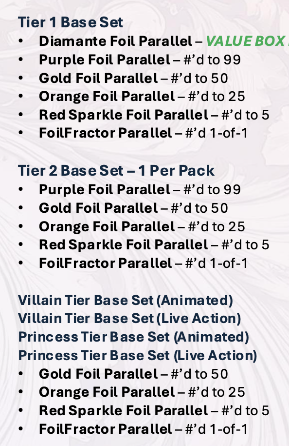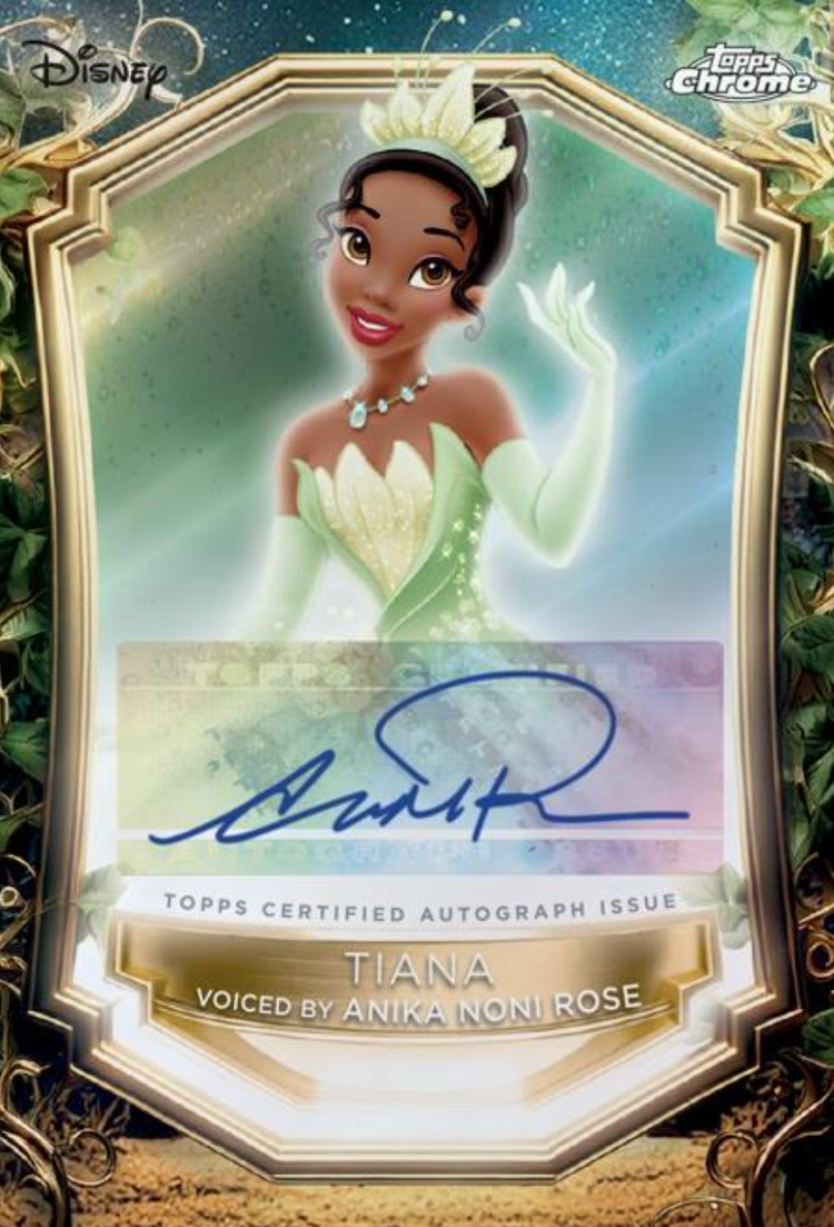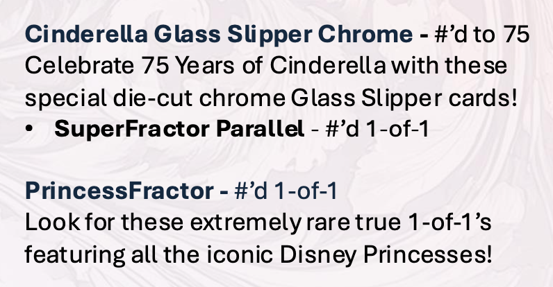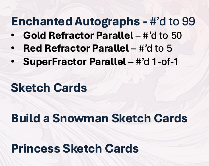 Update: More details are in with 1/1 Princessfractors in the mix, voice actor autos (/99) with three parallel types (see below), Build A Snowman sketch cards, Princess sketch cards, Cinderella Glass Slipper Chrome (/75), Wish Upon A Star and more with parallels for all noted below. Standard inserts (Furry, Castles, Greeting, Cinderella) will have Gold (/50), Orange (/25), Red (/5) and 1/1 Foilfractor parallels.